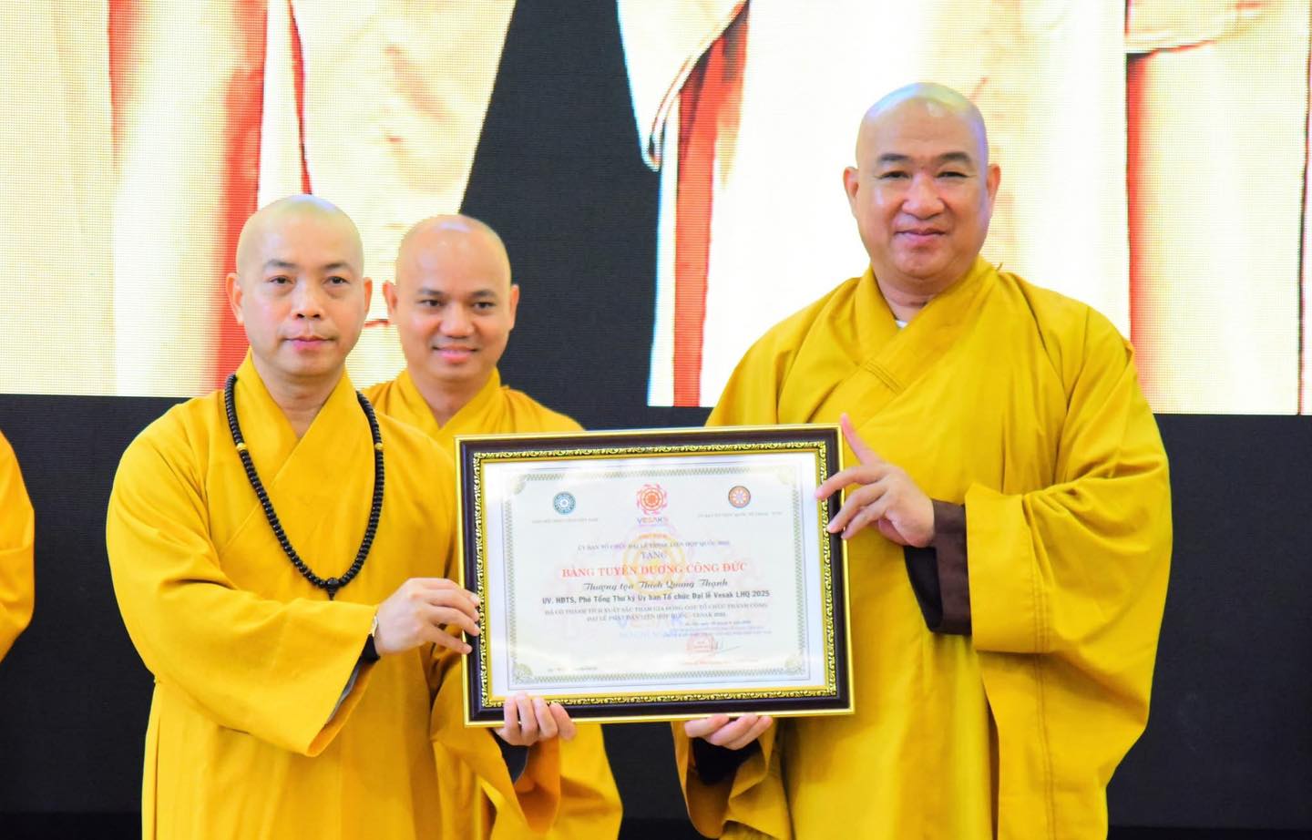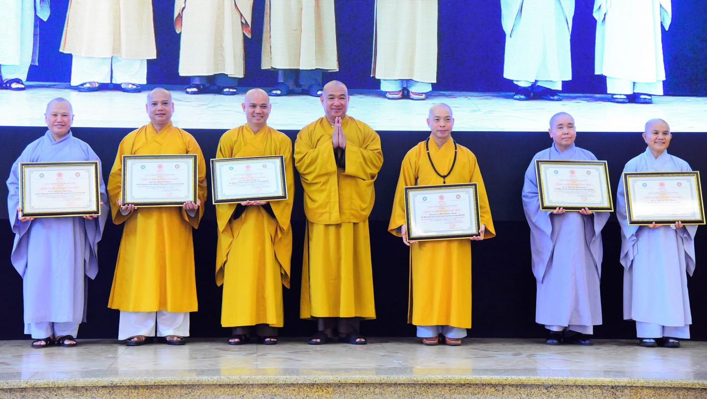 Tiếp đó, Đại đức Thích Minh Ân công bố quyết định trao bằng tuyên dương công đức của Ban Thường trực HĐTS GHPGVN. Thượng tọa Thích Phước Nguyên đã thay mặt Trung ương Giáo hội trao tặng Bằng tuyên dương công đức và Giấy chứng nhận đến các cá nhân đã có nhiều đóng góp nổi bật, nhằm ghi nhận tinh thần phụng sự đầy trí tuệ, trách nhiệm và từ bi của Ban Điều phối TNV Đại lễ Vesak 2025.