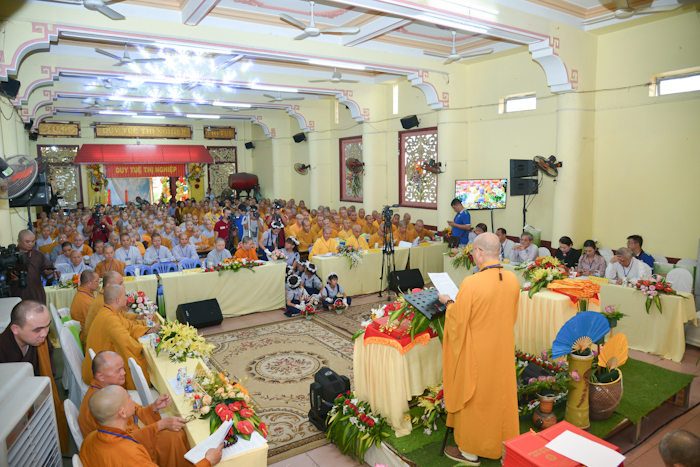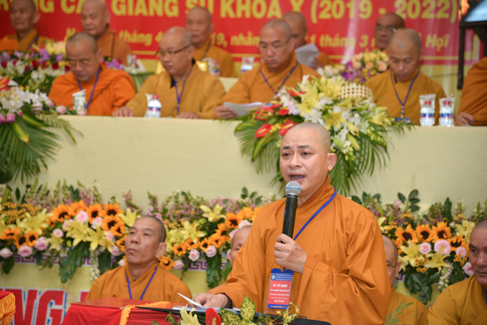 ĐĐ.Thích Quảng Tiến báo cáo công tác tổ chức giảng dạy 2 Lớp đạo tạo Cao – Trung cấp Giảng sư