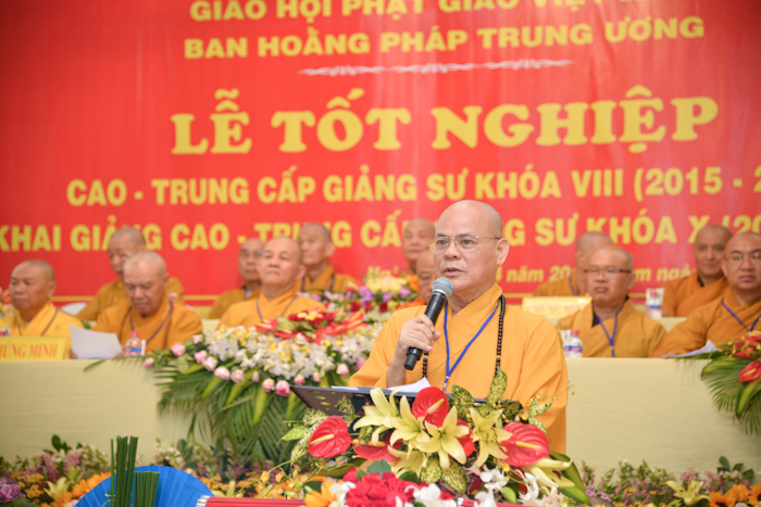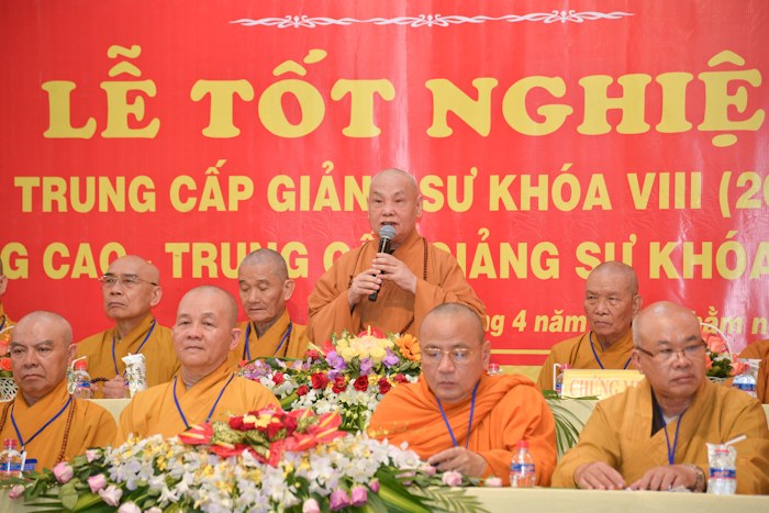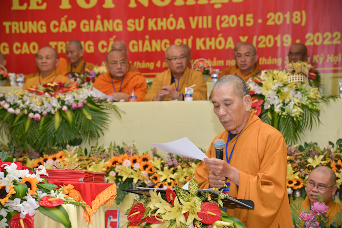 Dịp này, toàn thể chư tôn đức BHPTW, Lớp đào tạo Cao – Trung cấp Giảng sư, Tăng Ni sinh có mặt đã trang nghiêm lắng nghe lời đạo từ của Trưởng lão HT.Thích Thiện Nhơn – Chủ tịch HĐTS GHPGVN. Thay mặt TWGH, Hòa thượng chúc mừng Tăng Ni tốt nghiệp Lớp đào tạo Cao – Trung cấp Giảng sư khóa VIII và trúng tuyển khóa X. Hòa thượng đặt huy vọng cao đối với Tăng Ni sinh vừa tốt nghiệp, tương lai trở thành một hoằng pháp viên, đưa chánh pháp của Đức Như Lai lan truyền đến mọi vùng miền, để mọi người khắp nơi đều biết đến Phật pháp, từ đó chúng sanh được lợi lạc, nhà nhà được hạnh phúc.