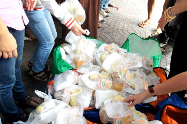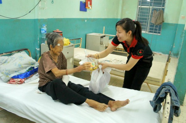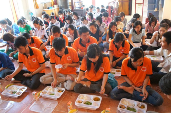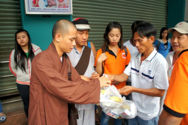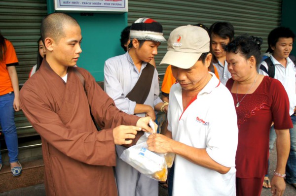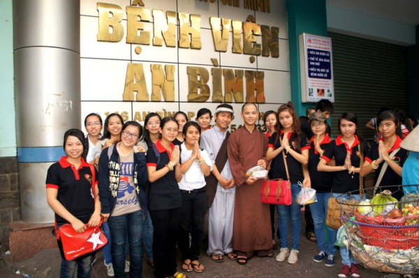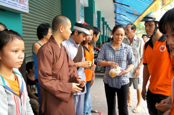 Cuối buổi sinh hoạt, dưới sự hướng dẫn của Đại đức Thích Lệ Bình và Tăng sinh Thích Nguyên Từ, đại chúng đã chuẩn bị thức ăn vào hộp và chuyển đến Bệnh viện An Bình để phát tặng 300 phần cơm chay cho bệnh nhân.