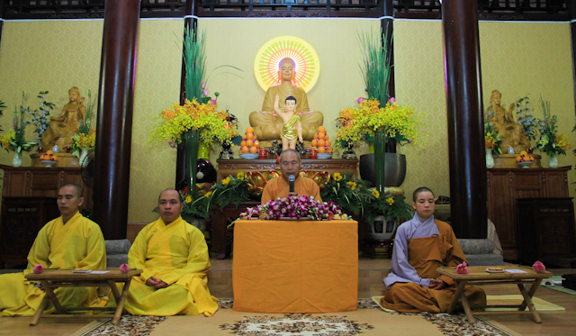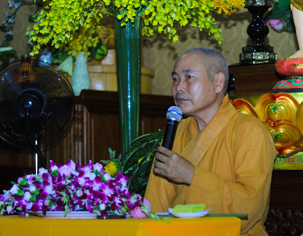 Trong thời gian đại chúng thưởng thức trà, Hòa thượng viện chủ gởi đến một pháp thoại ngắn với chủ đề “Vui thay Phật ra đời”. Hòa thượng nhắc đến sen, một loài hoa tượng trưng cho trí tuệ, sự tinh khiết và nghị lực; một biểu tượng gắn liền với sự ra đời của Phật. Phật thị hiện ở cõi trần với hình hài một con người bình thường như bao người, nhưng Người lại mang một tình thương lớn, với 6 năm khổ hạnh, 49 ngày đêm thiền định và chứng đạt trí tuệ giác ngộ. Từ đó, hướng dẫn tha nhân tìm thấy ánh sáng mầu nhiệm giải thoát, xóa mờ vô minh.
