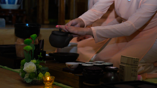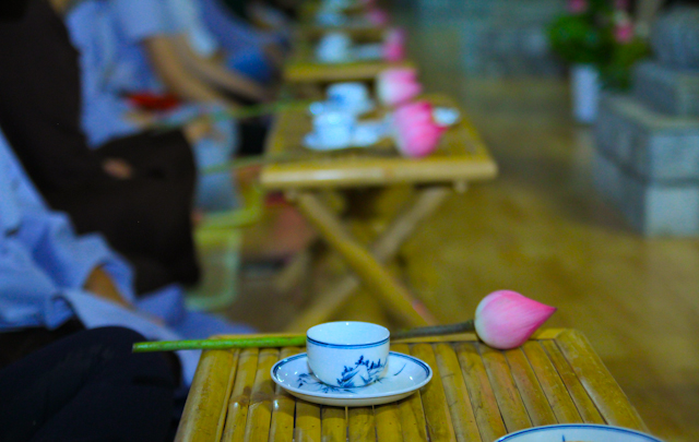Sau 30 phút lắng động thân tâm với thiền, không gian chánh điện trở nên yên lặng và thanh tịnh, mọi người chăm chú xem nghệ thuật pha trà đạo của nghệ nhân. Những chén trà lần lượt được rót đầy, thoáng một hương thơm nhẹ hòa với tấm lòng của nghệ nhân, làm cho người dùng có một cảm giác được nâng niu từ thân đến tâm.