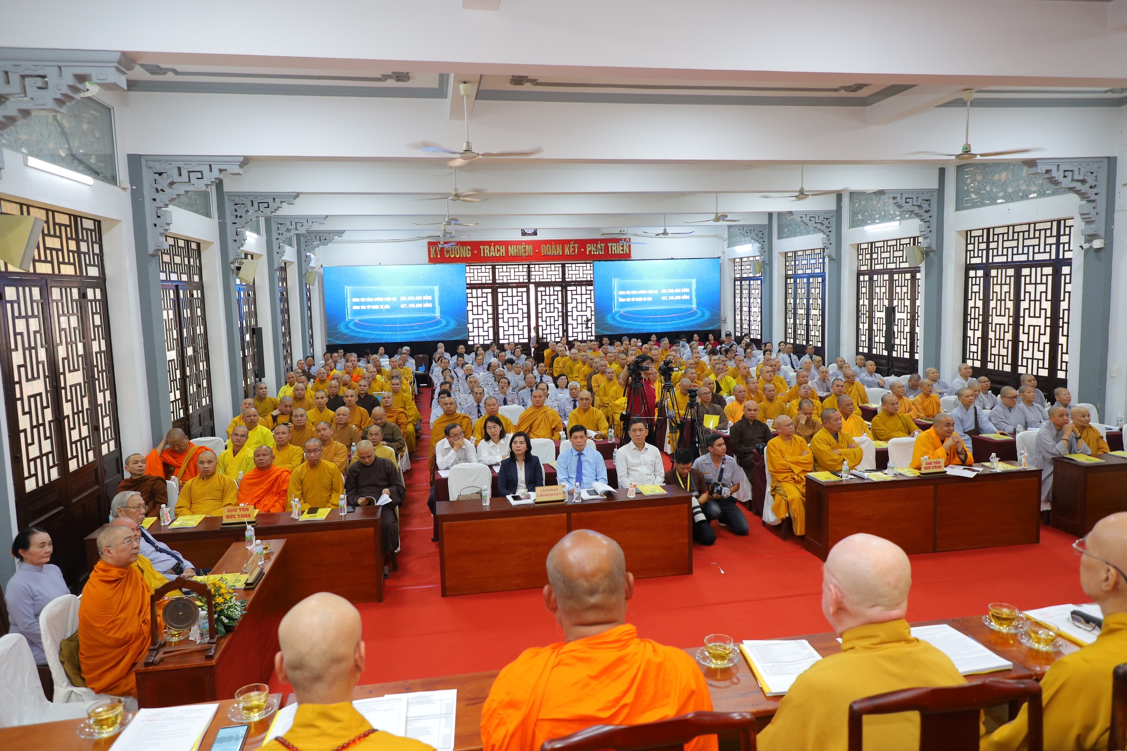Tại hội nghị, chư tôn đức cùng toàn thể đại biểu xem phóng sự tổng kết hoạt động Phật sự của Ban Hướng dẫn Phật sự T.Ư trong năm 2024