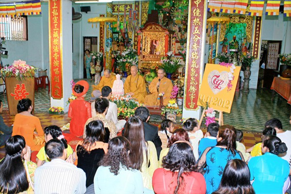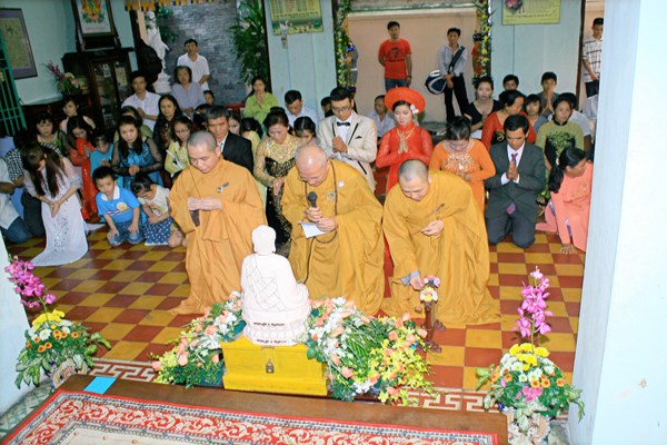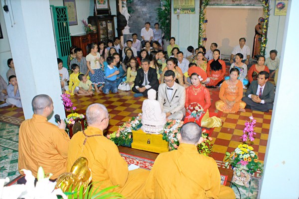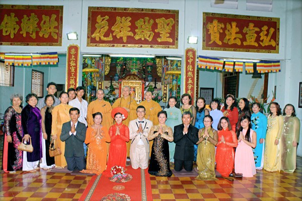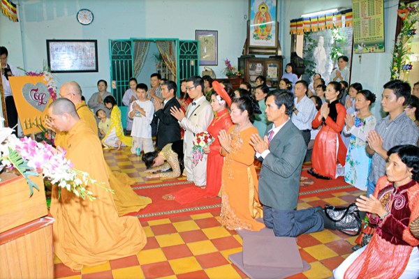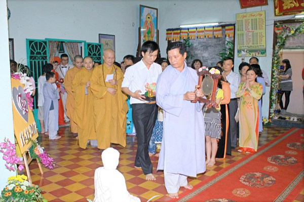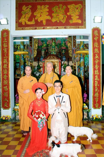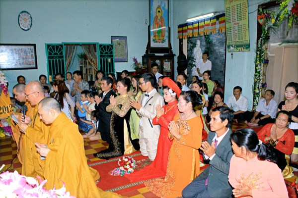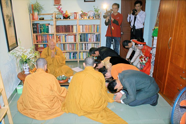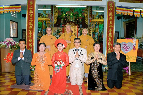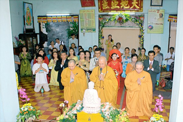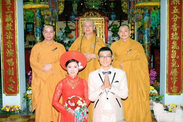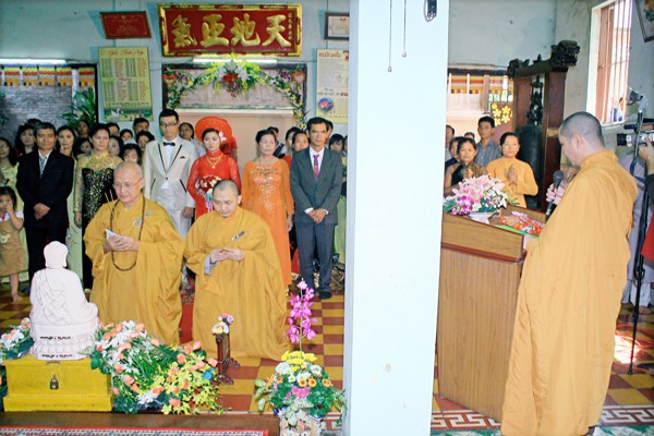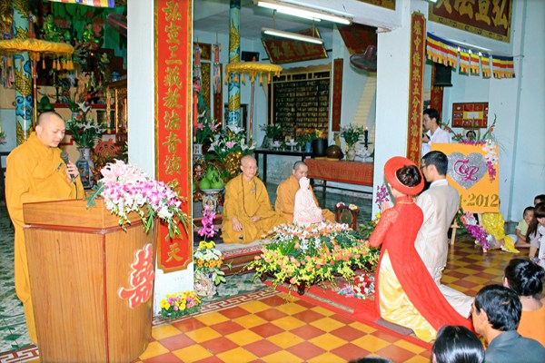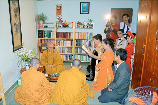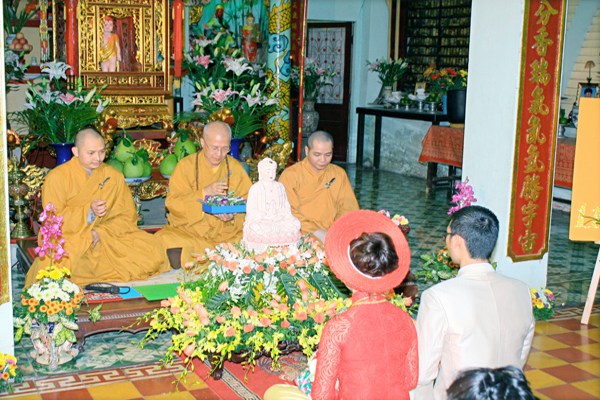 Chứng minh chúc phúc buổi lễ có sự hiện diện của TT. Thích Chơn Không, Phó Ban Hướng dẫn Phật tử TW, trụ trì chùa Thiên Tôn, Q. 5, ĐĐ. Thích Giác Đạo, ĐĐ. Thích Thanh Thắng và quý Phật tử bản tự cùng quan khách hai họ.