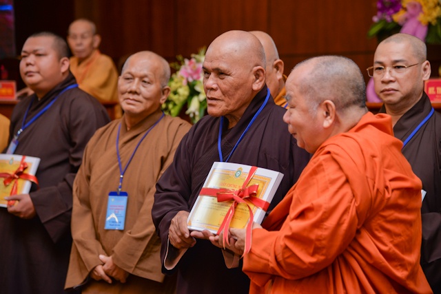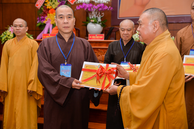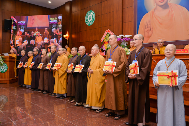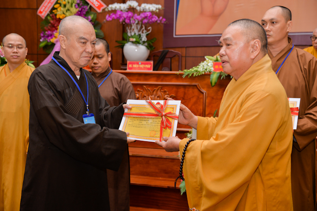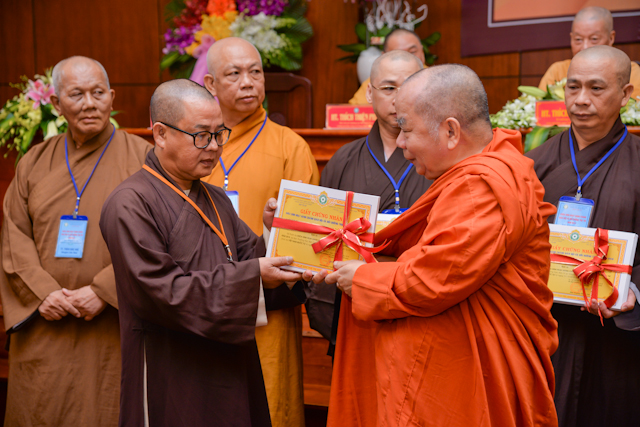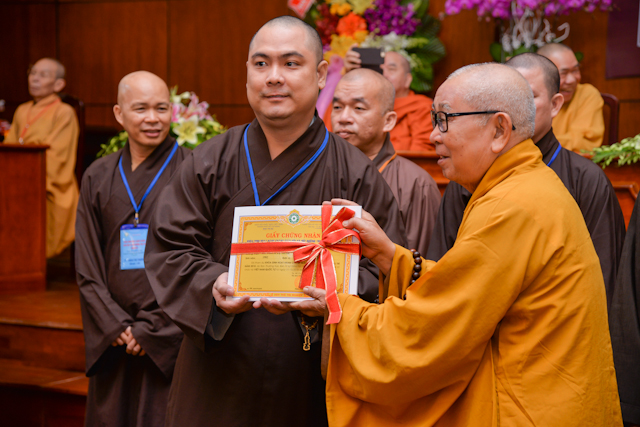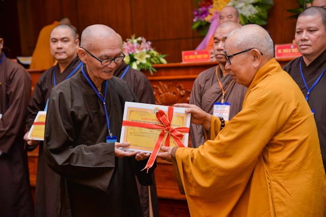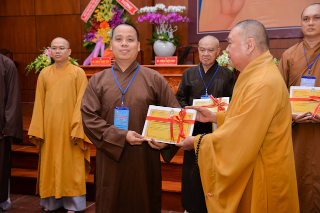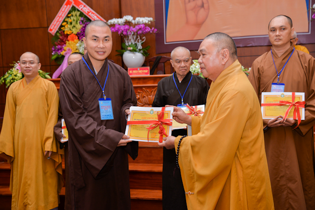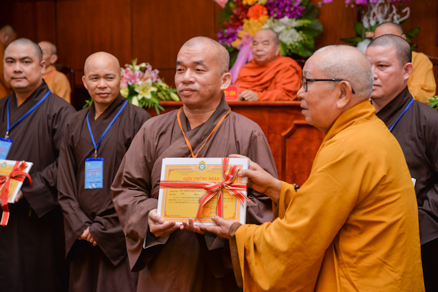 Tại lễ bế mạc, thay mặt Ban tổ chức, Chư tôn Hòa thượng Chứng minh đã trao chứng chỉ hoàn thành khóa học Hành chánh Giáo hội và Bồi dưỡng trụ trì năm 2018 đến đại diện học viên thuộc 12 ban ngành và 24 quận huyện.