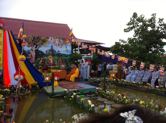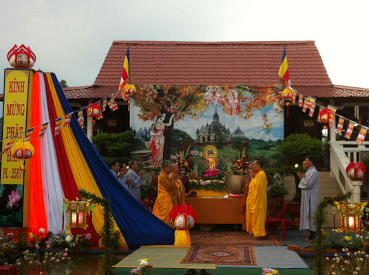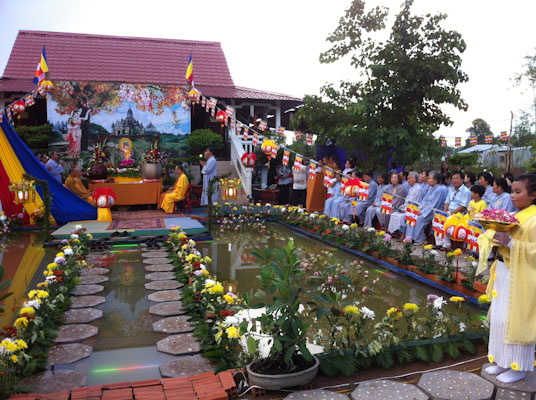 Trước đó, vào lúc 15g30 bửa tiệc chay tự chọn gần 50 món cũng được diễn ra ấm cúng chan hòa tình yêu thương đoàn kết, gắn bó thắm tình đạo vị, Hòa Thượng và Chư Tăng cùng hoan hỷ khai tiệc, đến từng gian hàng thăm hỏi, động viên các thành viên ban ẩm thực. Tất cả như cùng chung lòng hoan hỷ hướng về cúng dường ngày Đức Phật Đản sanh.Như chương trình dự định, 17g lễ kỷ niệm Đức Phật Đản sanh PL 2557 đã được diễn ra trang nghiêm thanh tịnh. Sau khi cung thỉnh chư Tôn thiền đức quan lâm lễ đài, là phần dâng Lục cúng dường của các thiếu nữ phật tử,Tiếp sau là những lẵng hoa tươi thắm của các đạo tràng và Phật tử lần lược dâng lên cúng dường ngày Đức Phật Đản Sanh.