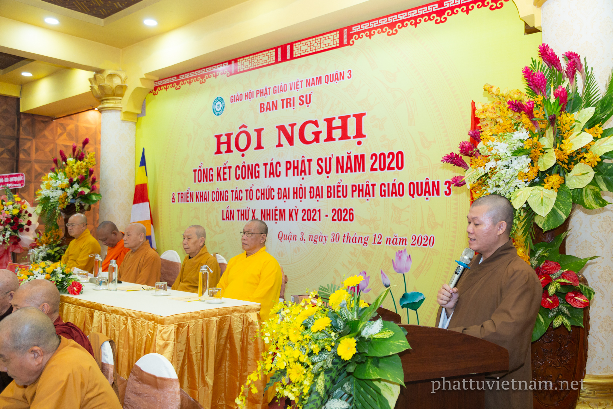 Báo cáo tổng kết Phật sự năm 2020, ĐĐ.Thích Thiện Châu – Phó ban kiêm Chánh Thư ký BTS Phật giáo Q.3 cho biết: Tại Quận 3, dưới sự chỉ đạo của Ban Thường trực Ban Trị sự GHPGVN Thành phố, Ban Trị sự Quận cùng Tăng Ni, Phật tử các chùa trong địa bàn đã thực hiện các công tác Phật sự trọng tâm như: Tổ chức Đại lễ Phật đản, tổ chức Khóa An cư Kiết hạ PL. 2564 – DL. 2020, Tưởng niệm 57 năm Bồ Tát Quảng Đức vị Pháp thiêu thân và chư Thánh Tử Đạo, chư vị tiền bối hữu công với Giáo hội và Đất nước,v.v…. Ban Trị sự Quận cũng chỉ đạo triển khai các mặt công tác Phật sự như: Xây dựng Kế hoạch tổ chức Đại hội Đại biểu Phật giáo Quận 3 nhiệm kỳ X (2021-2026), các hoạt động của các Ban trực thuộc Phật giáo Quận, các phong trào dân cử và đoàn thể tại địa phương.