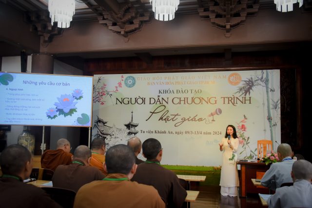 Trong chương trình khóa đào tạo “Người Dẫn Chương Trình Phật Giáo” do Ban Văn hóa Phật giáo TP.HCM tổ chức. Kỹ năng dẫn và soạn lời dẫn chương trình nghệ thuật là một môn học quan trọng do MC Lê Thị Phương Thảo đứng lớp. Hai nội dung quan trọng này được giảng viên chia sẻ về lý thuyết,sau đócác học viên sẽ thực hành kỹ năng dẫn chương trình tại lớp.