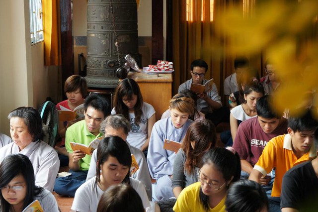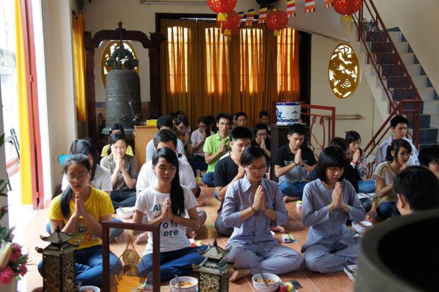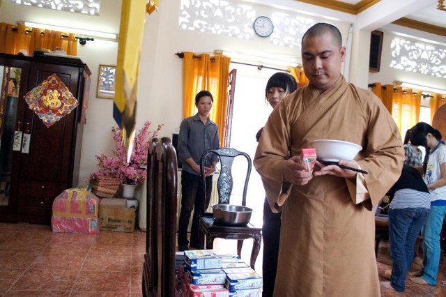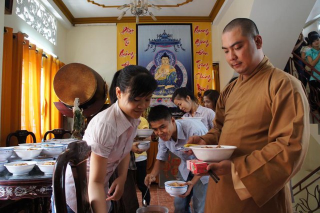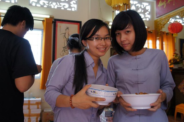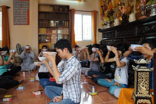 12h00: Đại chúng thọ thực trong chánh niệm, nguyện sống theo tinh thần hiếu nghĩa, tri ân và báo ân, lý tưởng tu học phụng sự độ đời.