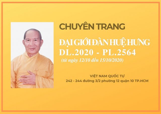 Như đã đưa tin, Đại giới đàn Huệ Hưng do BTS GHPGVN Tp.Hồ Chí Minh tổ chức sẽ diễn ra từ ngày 12/10 đến 15/10/2020 (nhằm ngày 26 – 29/8/Canh Tý), Ban Biên tập PTVN sẽ cập nhật các thông tin liên quan về sự kiện trọng đại này.