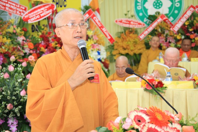 TT Thích Chơn Không – Phó ban kiêm chánh thư ký Ban HDPT TW báo cáo chương trình hoạt động Phật sự Ban HDPT TW nhiệm kỳ VII (2012-2017).