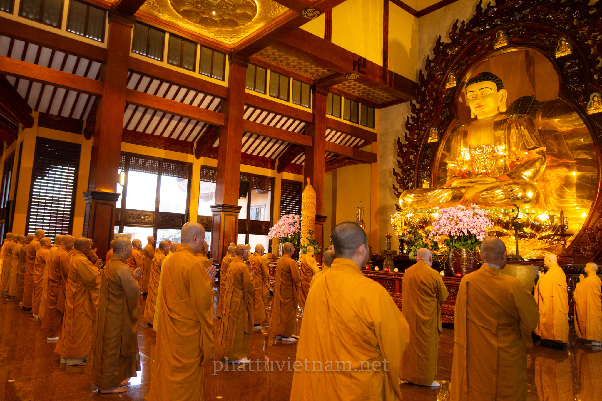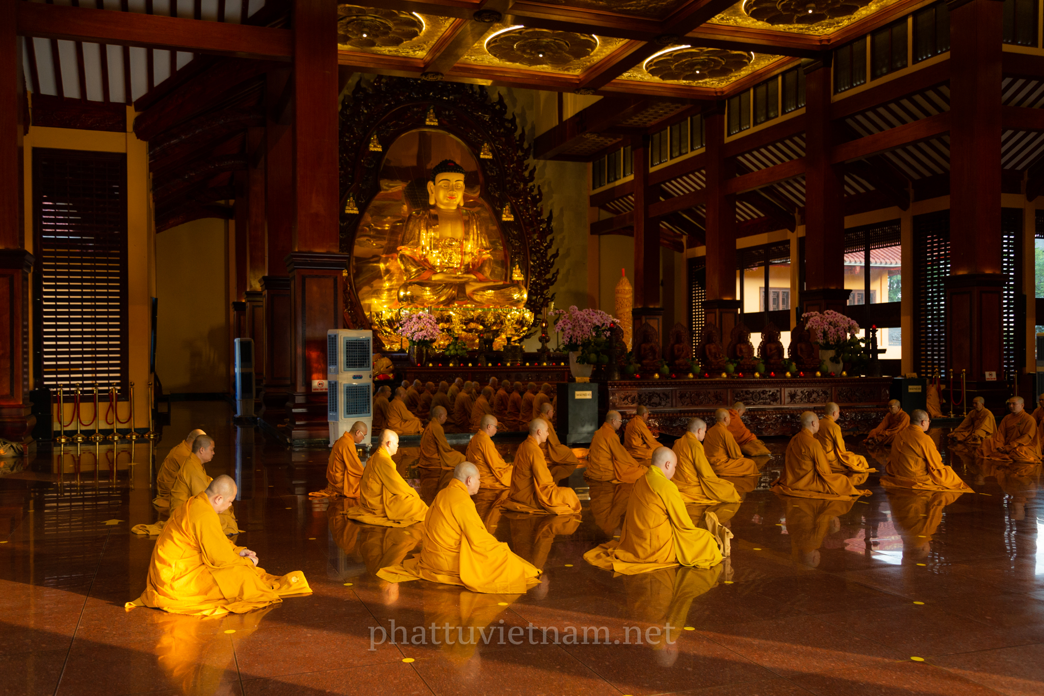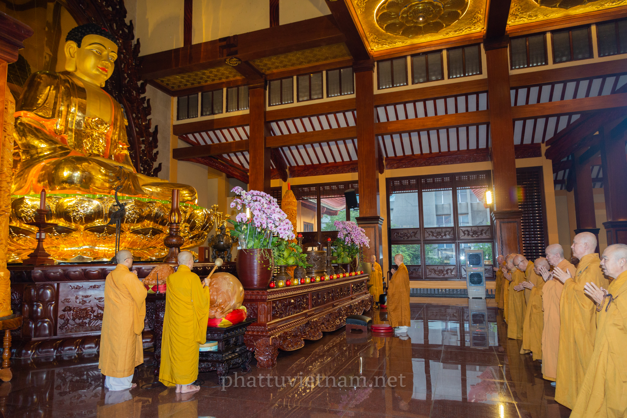 Sau khi đảnh lễ chư Tổ sư tại Tổ đường, Trưởng lão HT.Thích Trí Quảng – Phó Pháp chủ kiêm Giám luật HĐCM, Trưởng BTS GHPGVN TP.HCM cùng chư tôn đức đã trang nghiêm trước Chánh điện, lễ Phật, sám hối và thính giới Tỳ-kheo, Bồ-tát.