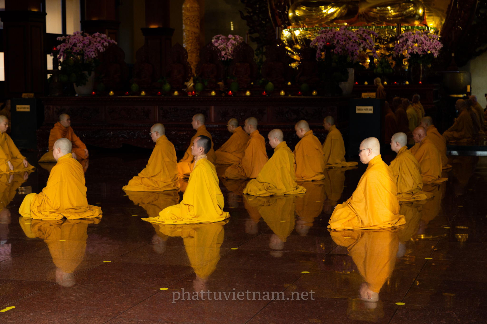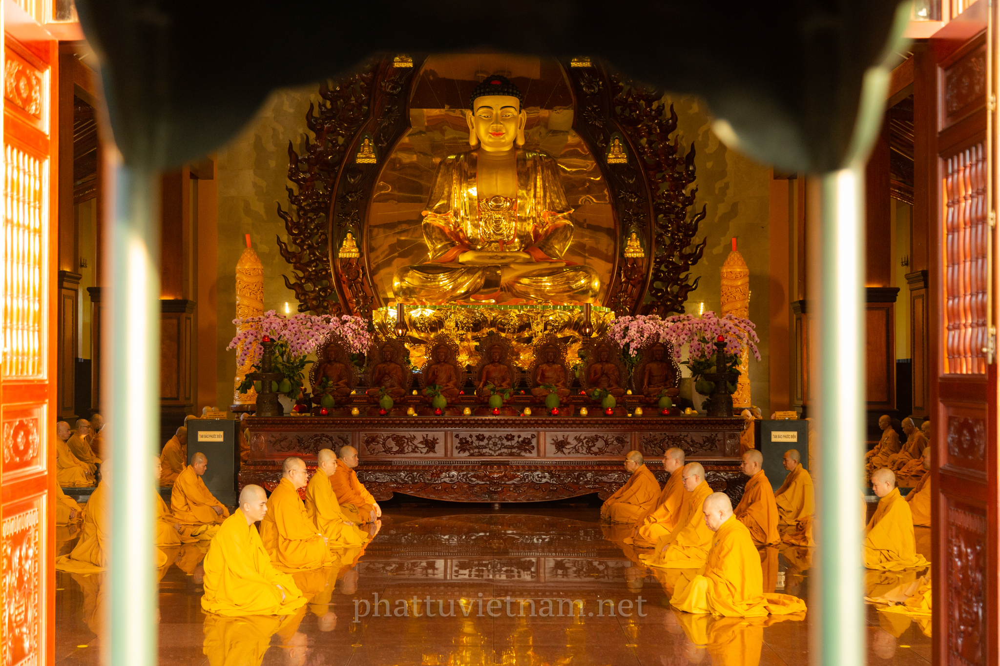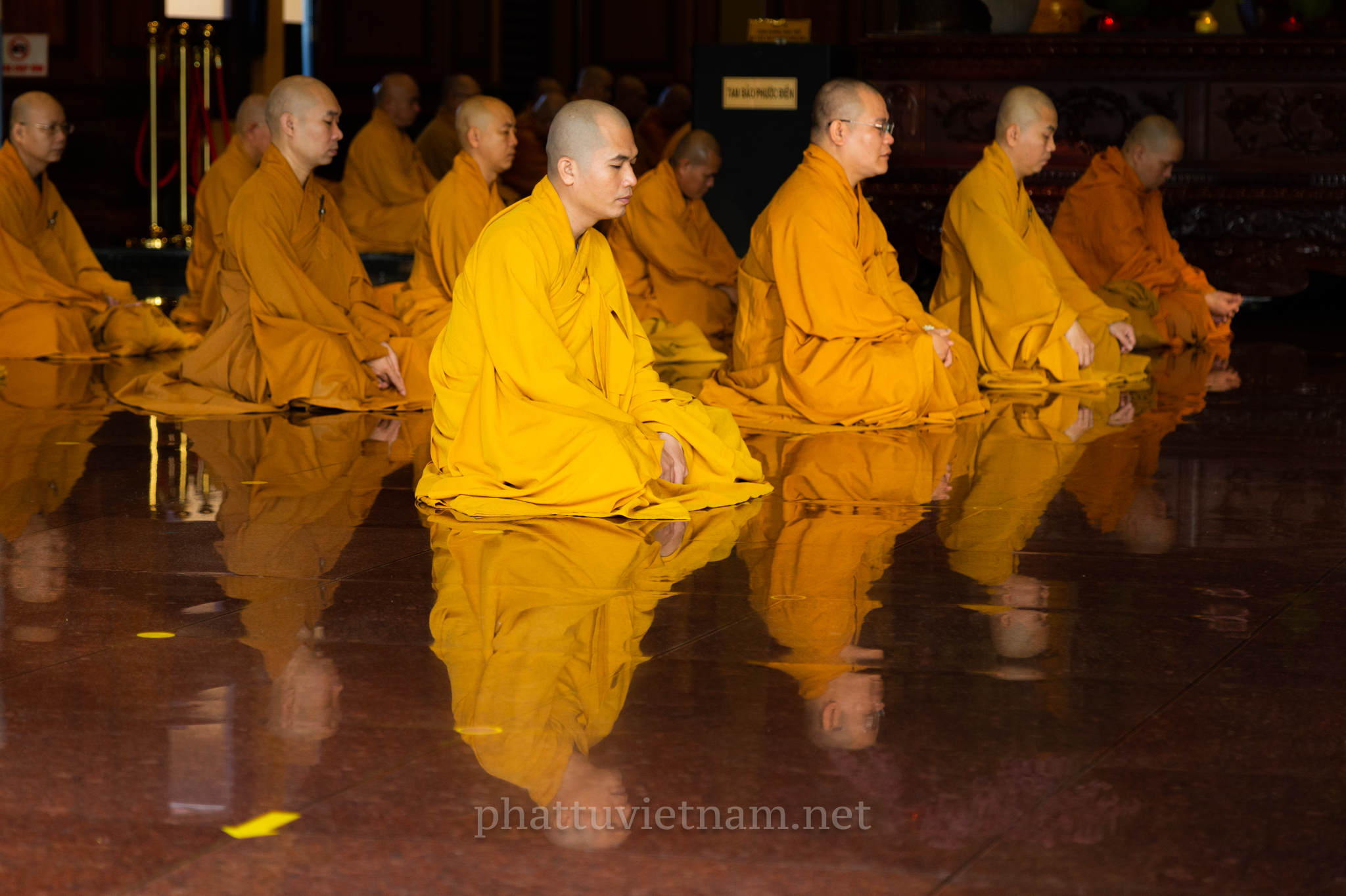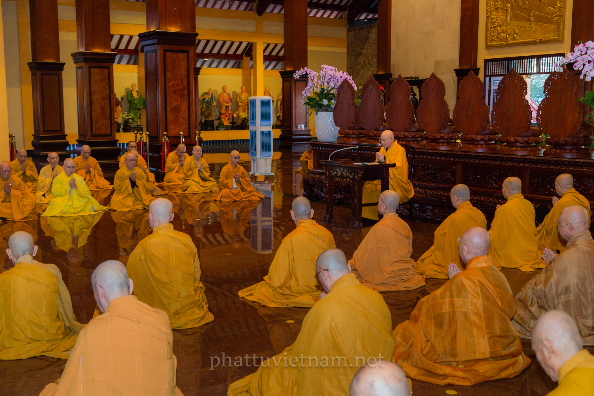 Sau khi đảnh lễ chư Tổ sư tại Tổ đường, Trưởng lão HT.Thích Trí Quảng – Phó Pháp chủ kiêm Giám luật HĐCM, Trưởng BTS GHPGVN TP.HCM cùng chư tôn đức đã trang nghiêm trước Chánh điện, lễ Phật, sám hối và thính giới Tỳ-kheo, Bồ-tát.