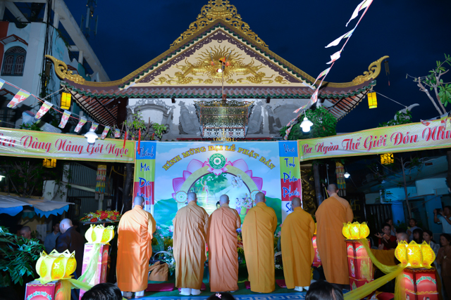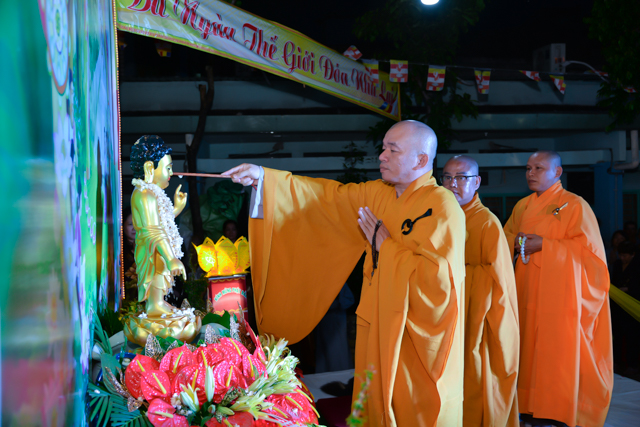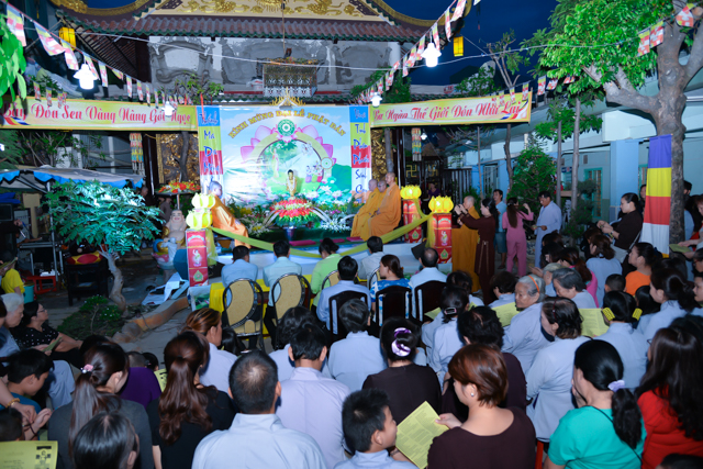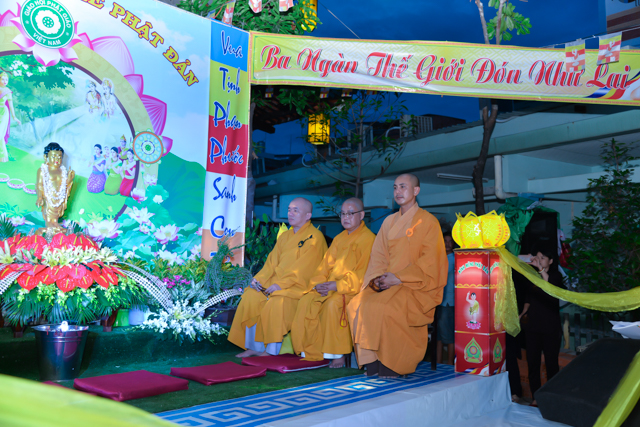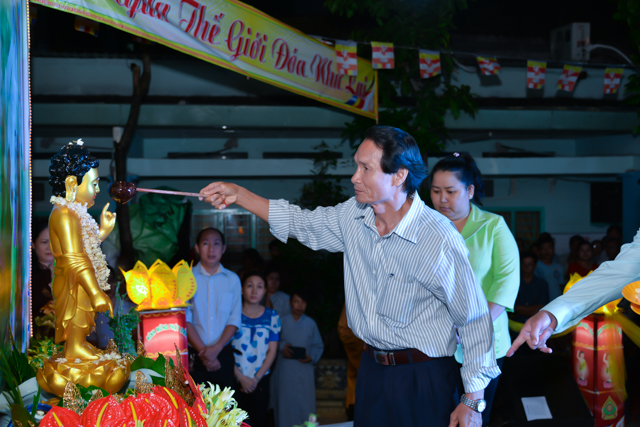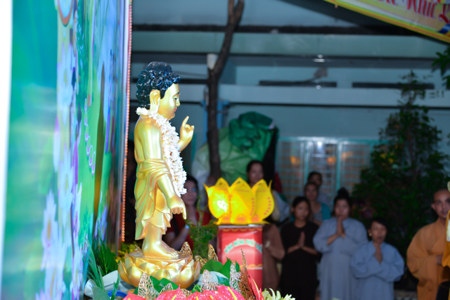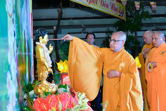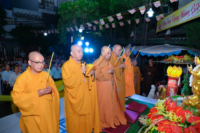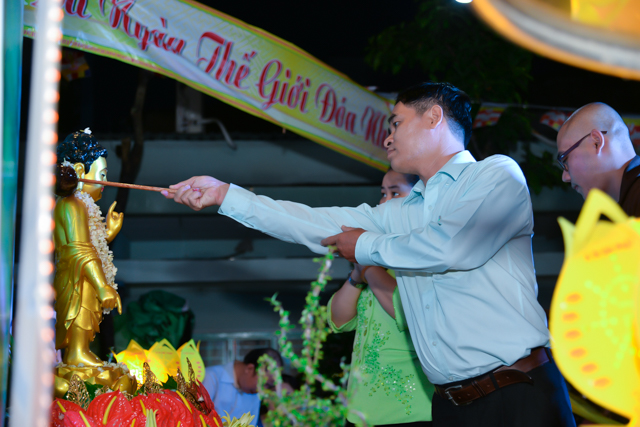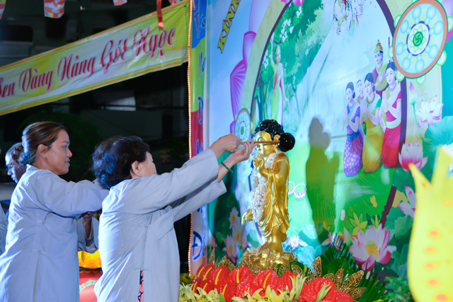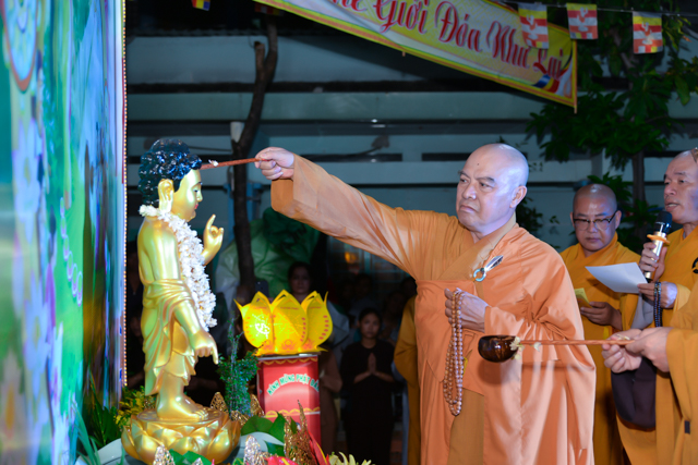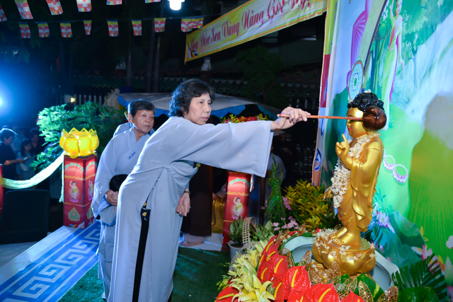 Sau 3 hồi chuông trống linh thiêng rước lễ đản sanh đến phần niẻm hương, Quý thầy cùng quan khách và nam nữ Phật tử có thời kinh ngắn và dâng nước cúng dường kim thân Đức Từ Phụ.