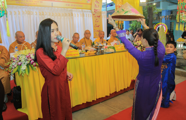Tiếp theo, Đại đức trụ trì đã hướng dẫn cho chúng Phật tử làm lễ Dâng pháp y lên Chư tôn đức chứng minh nhằm tạo công đức thù thắng cho tự thân và hồi hướng cho cha mẹ hiện tiền phước thọ thân long, cha mẹ quá vãng siêu sinh tịnh độ.
