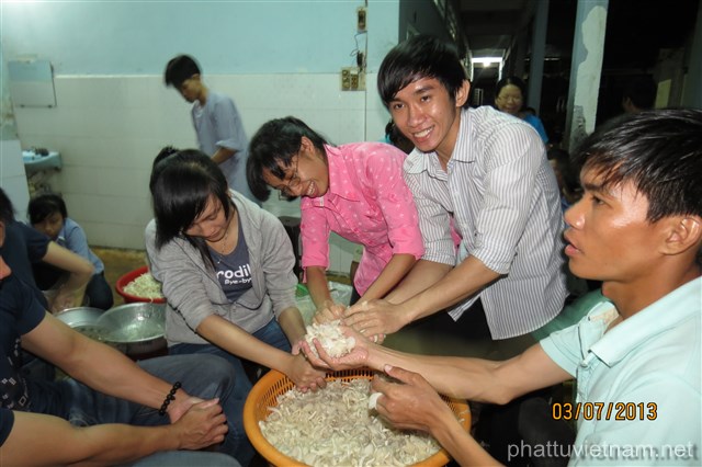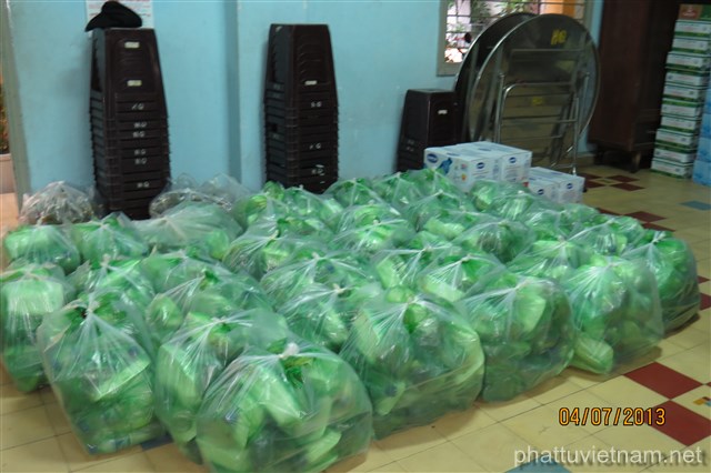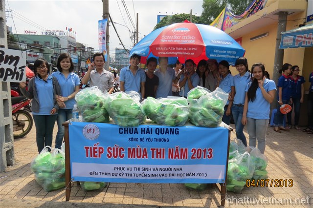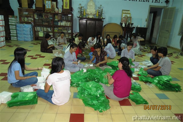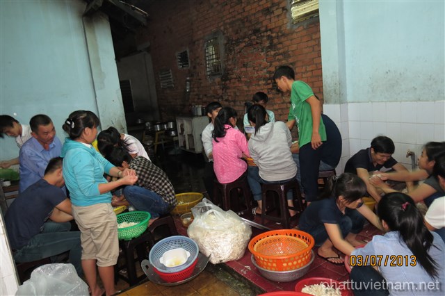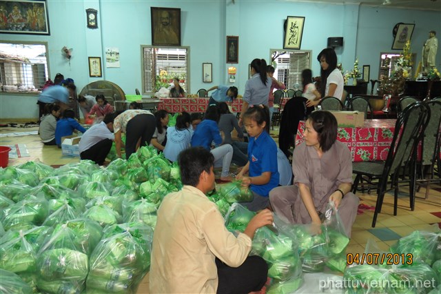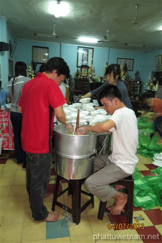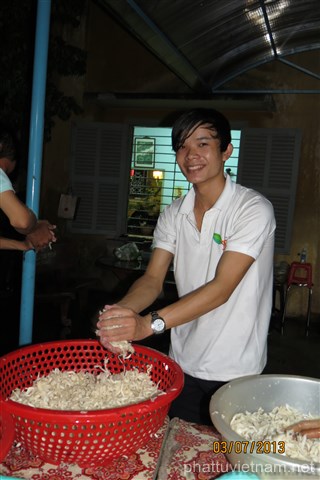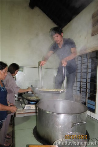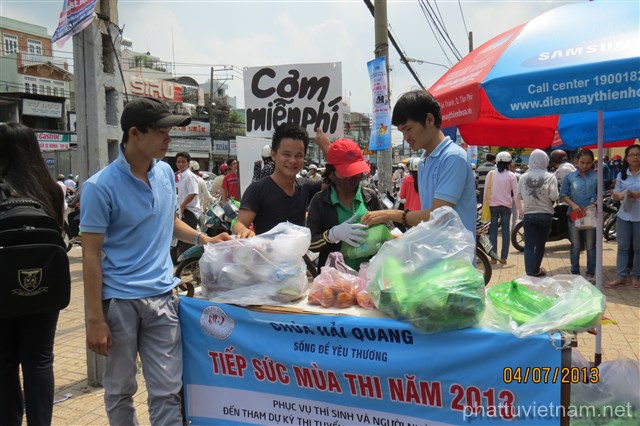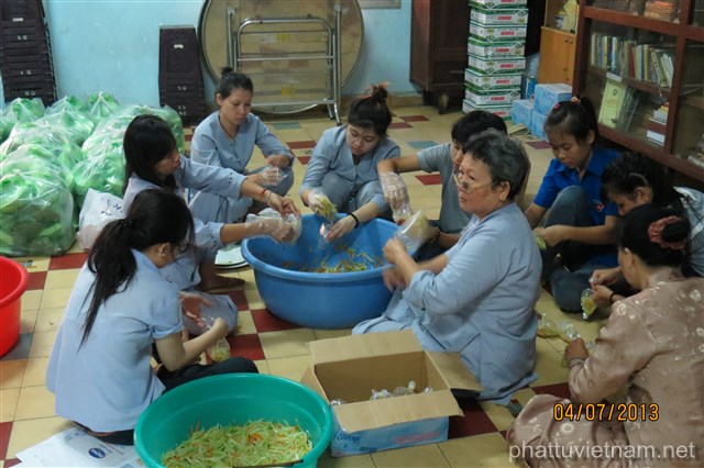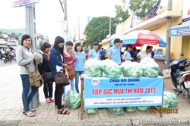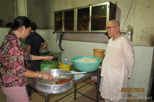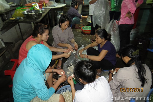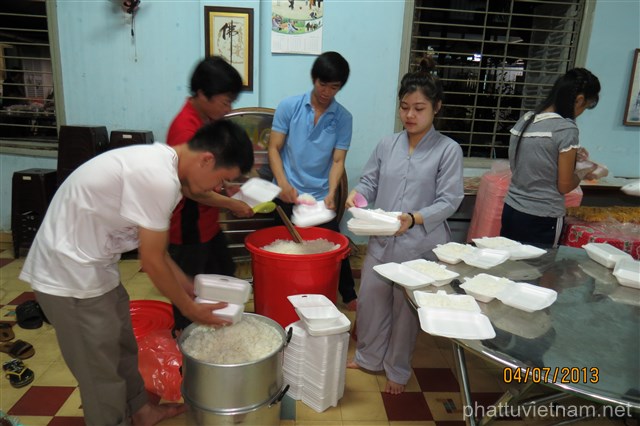 Để kịp chuẩn bị số lượng thức ăn lớn đạt tiêu chuẩn an toàn thực phẩm, mang lại sự an tâm và sức khỏe tốt cho các thí sinh trong mùa thi năm nay. Các Phật tử chùa, thành viên CLB Phật tử trẻ Hải Quang cùng với các bạn tình nguyện viên của trường ĐH Tài Nguyên và Môi Trường, đã làm việc suốt từ 15h00 chiều ngày 3 tháng 7 cho đến 9h00 sáng ngày 4 tháng 7 năm 2013.