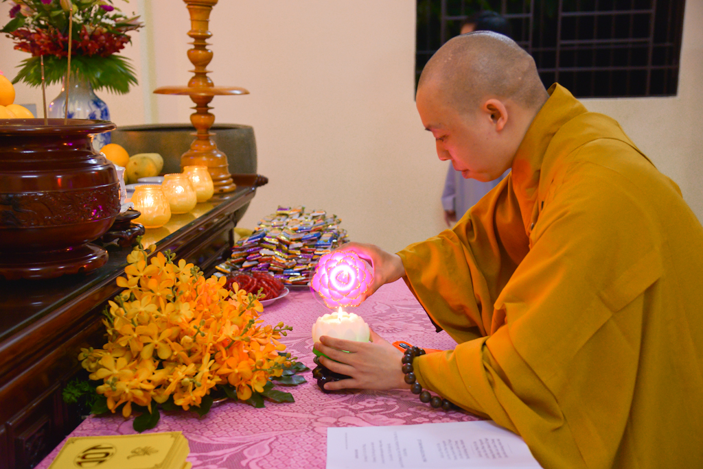 Đại đức trụ trì đón nhận ánh sáng từ bàn bàn Phật để truyền đăng tới hội chúng