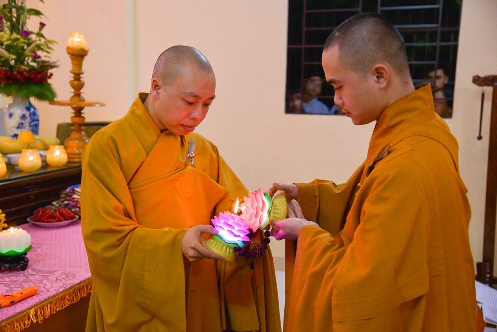 Đại đức trụ trì đón nhận ánh sáng từ bàn bàn Phật để truyền đăng tới hội chúng