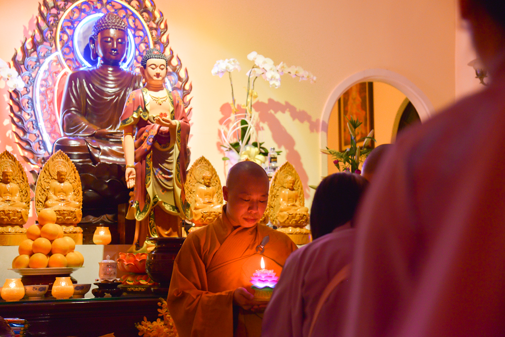 Phật tử lần lượt dâng đèn cúng Phật dưới sự chứng minh của chư tôn đức Tăng