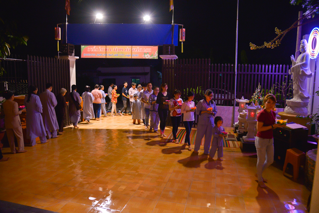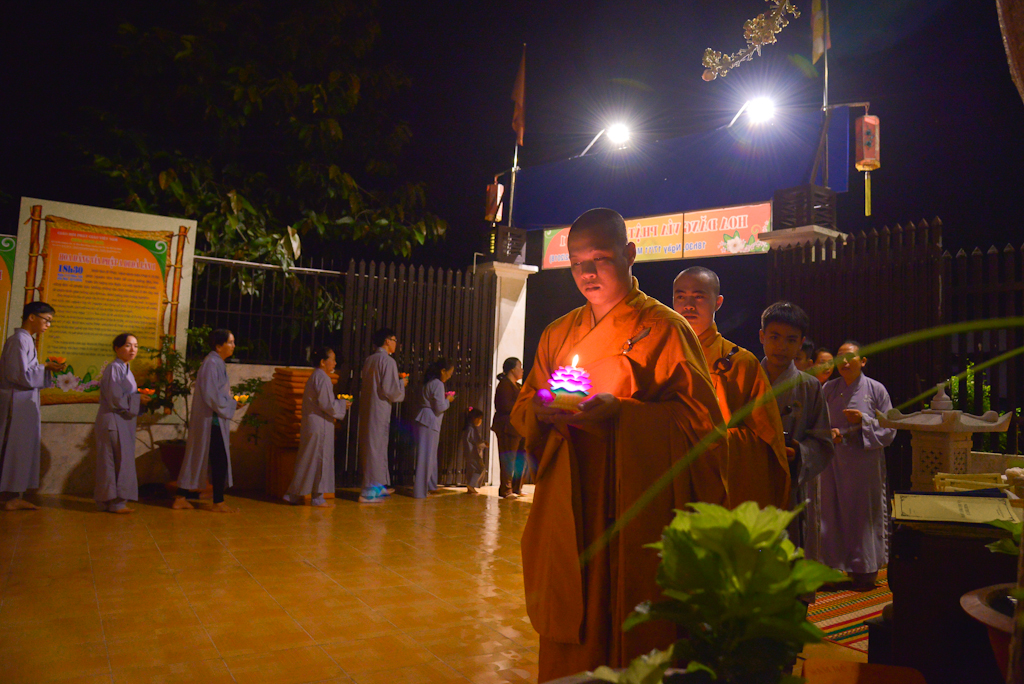 Tiếp theo, Đại đức trụ trì thỉnh đèn từ bàn Phật tiếp đăng cho chư Tăng và Phật tử để đại chúng cùng nhau đi kinh hành quanh chùa với thân tâm an trú nơi tiếng niệm Phật A Di Đà.