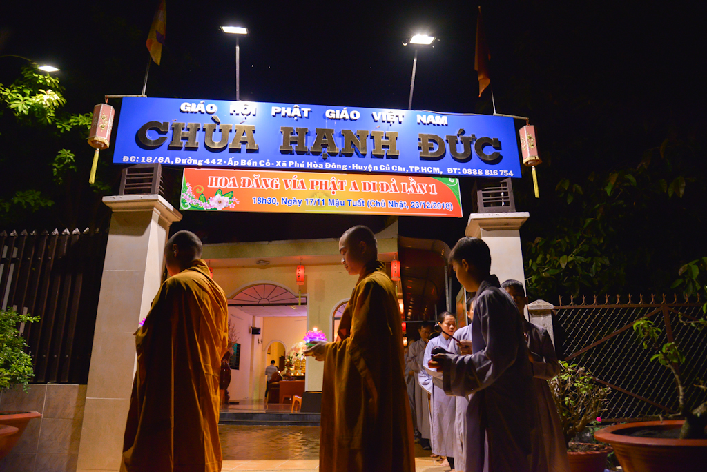Tối ngày 23/12 (17/11 Â.L), Đạo tràng Phật tử chùa Hạnh Đức (số 18/6A Đường 442, Xã Phú Hòa Đông, Huyện Củ Chi) đã trang nghiêm cử hành Lễ vía Đức Phật A Di Đà, thắp Hoa đăng, dâng đèn cúng Phật nguyện cầu quốc thái dân an, chúng sanh an lạc.