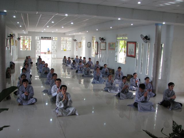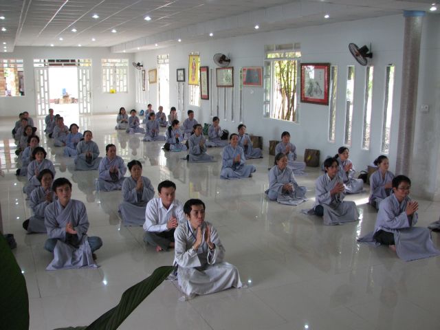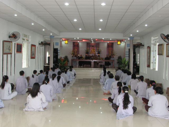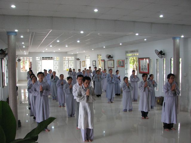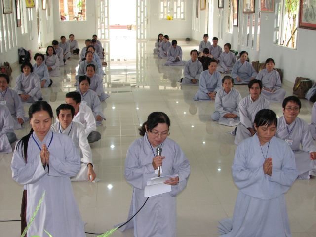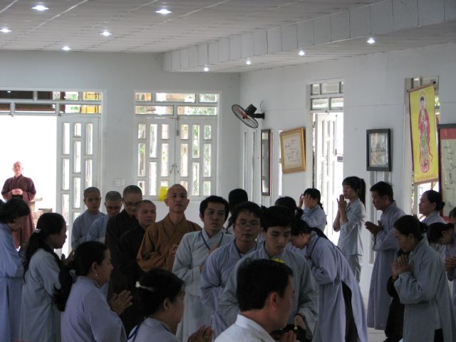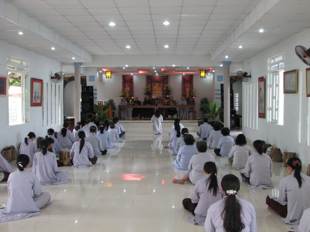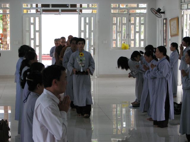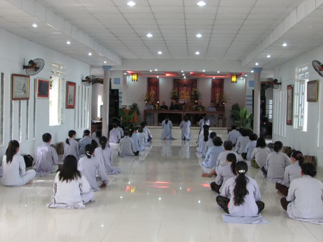 Đúng 8 giờ Phật tử vân tập đông đủ tại chánh điện để cung nghinh Chư Tôn Đức quang lâm chánh điện khai mạc khóa tu và thực hiện phần nghi thức phóng sanh.