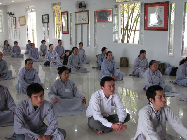 Sau phần phóng sanh Phật tử lại trở về giảng đường lắng nghe buổi pháp thoại và những lời sách tấn cuối năm của TT. Thích Quang Hạnh và TT. Thích Minh Thọ truyền trao.