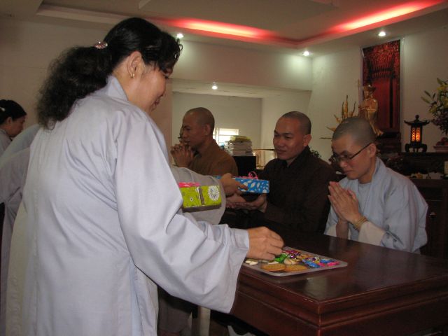 Tiếp đến những vật phẩm đã được quý Phật tử đại diện kính dâng lên tạ lễ cúng dường Chư Tôn Đức bằng tất cả tấm lòng tri ân về những ân đức mà Chư Tôn Đức đã dìu dắt hướng dẫn đạo tràng Phật tử tu tập trong một năm qua.
