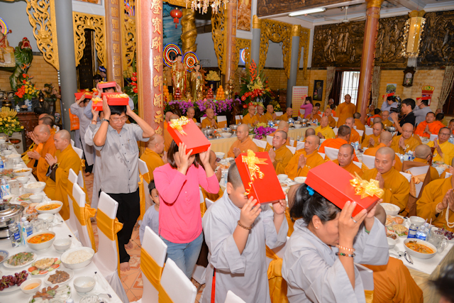 Tiếp theo, Đạo tràng Phật từ đội pháp y nhiễu Phật cúng dường lên Chư tôn đức. Thay mặt chư Hòa thượng chứng minh, HT.Thích Như Tín đã ban lời đạo từ tại buổi lễ, chúng Tăng hoan hỷ thọ nhận vật phẩm cúng dường, nhất tâm cầu nguyện cho pháp hội đạo tràng luôn sống an lành trong chánh pháp, cha mẹ hiện tiền được phước thọ tặng long, cửu hiền thất tổ được siêu sinh tịnh độ.