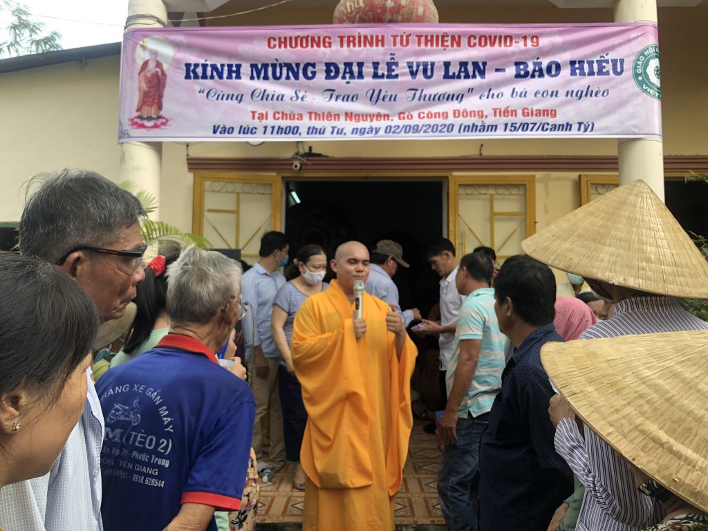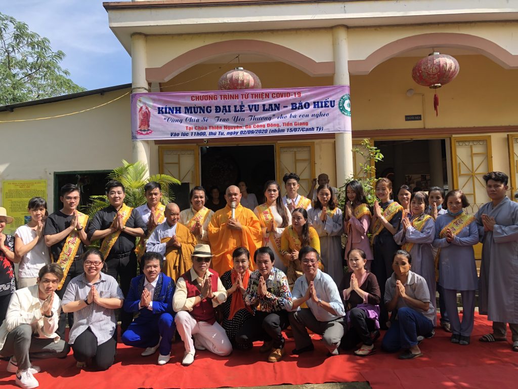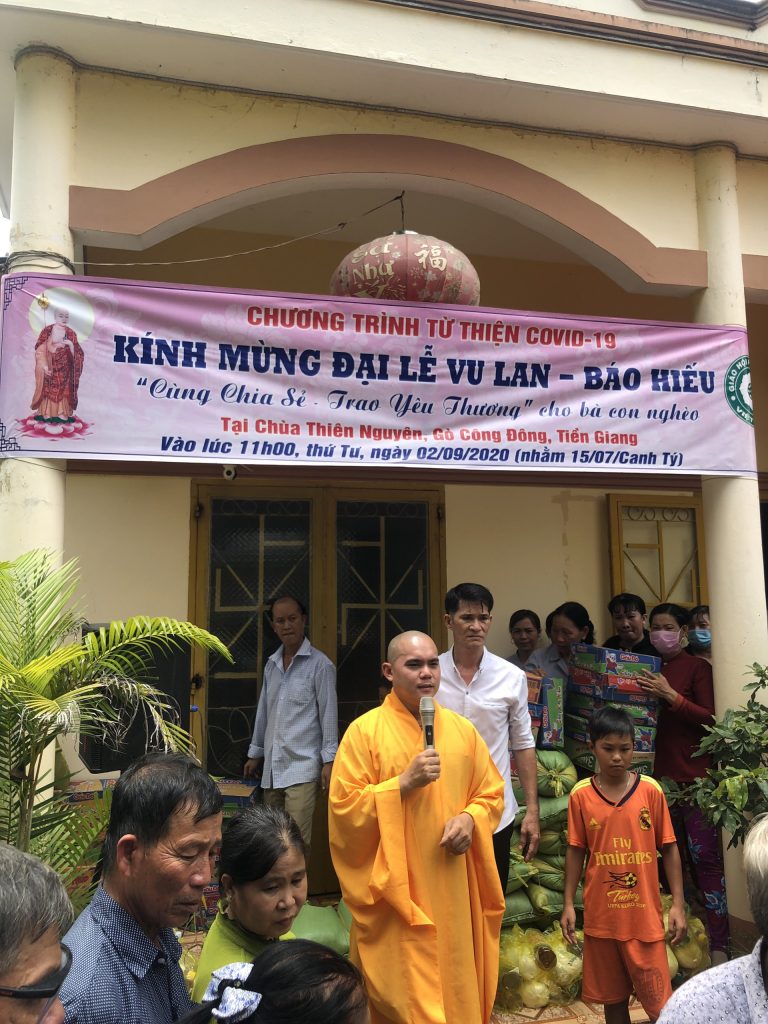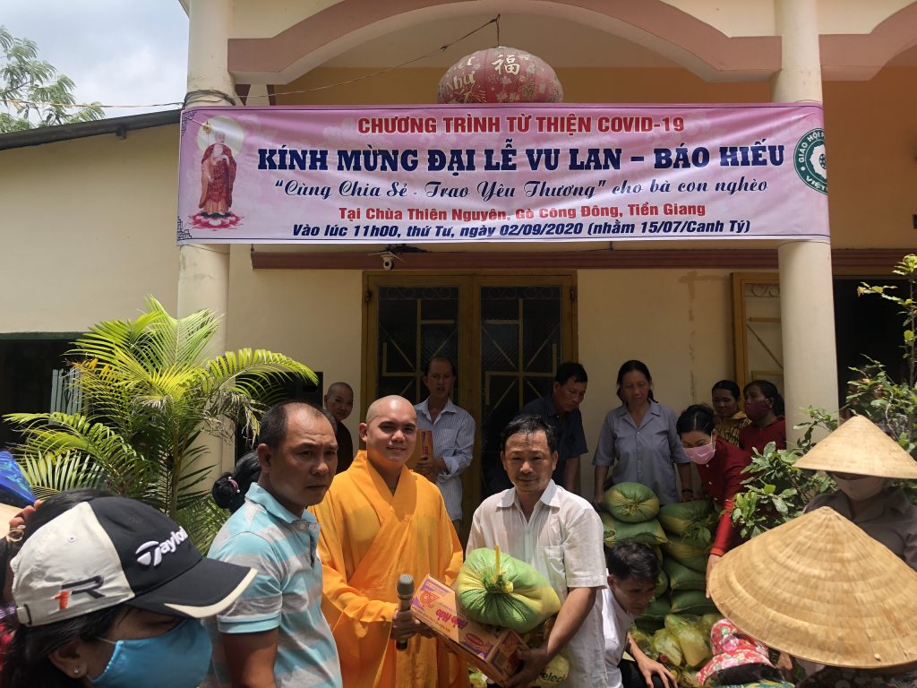 Như tin chúng tôi đã đưa, sau khi trao 150 phần quà trị giá 50 triệu đồng cho bà con nghèo có hoàn cảnh khó khăn tại chùa Nghệ sị Tp Hồ Chí Minh . Sáng ngày 15/07/ Canh Tý (02/09/2020), ĐĐ. Thích Huệ Đạo đã hướng dẫn Phật tử và nhóm văn nghệ sĩ chùa Nghệ sĩ Tp HCM tiếp tục đến Chùa Thiên Nguyên ( Tân Hoà, Gò Công Đông, Tiền Giang) trao tặng 150 phần quà cho bà con nghèo nơi đây. Mỗi phần quà trị giá 300.000 đ gồm: 10 ký gạo, 1 thùng mì, đường, dầu ăn, nước tương, khẩu trang v.v…