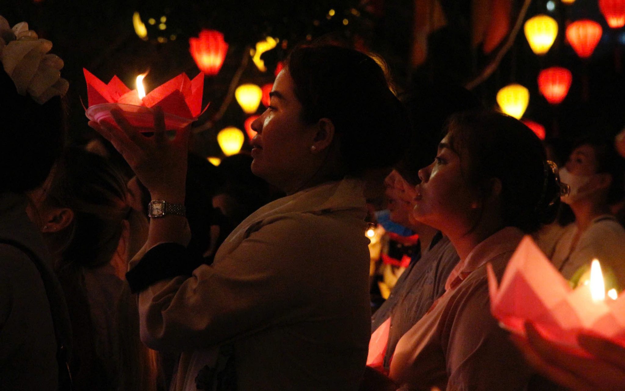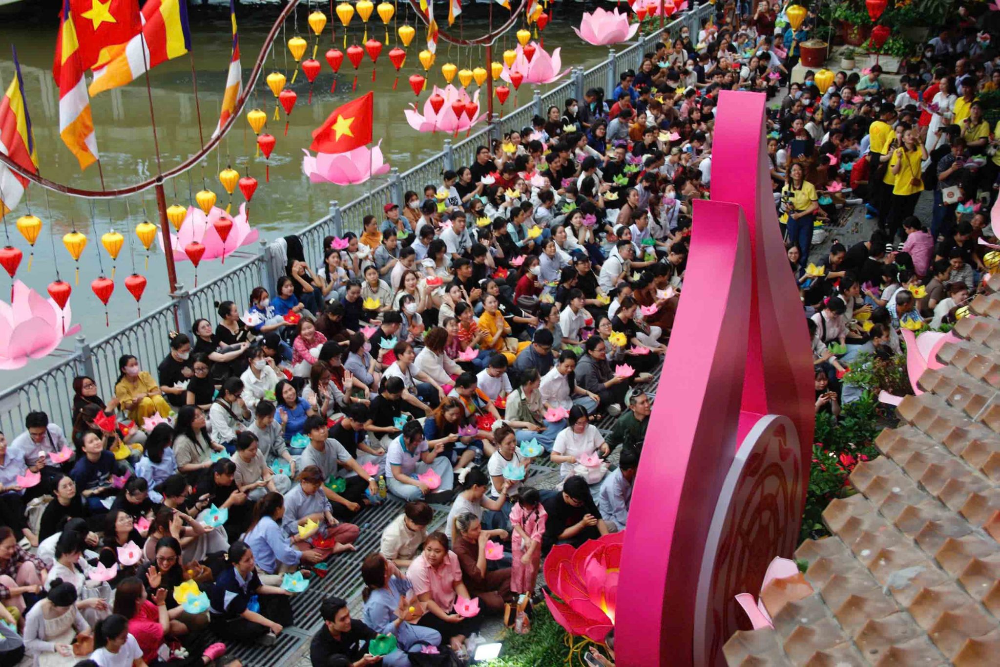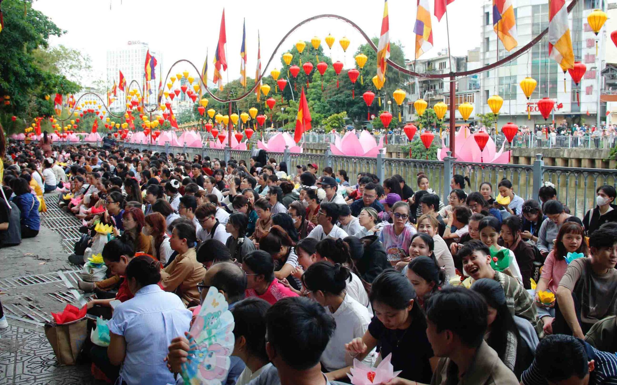 Từ khoảng 17:00 giờ, khu vực quanh cầu Lê Văn Sỹ đã ghi nhận lượng lớn người dân đến theo dõi và chuẩn bị tham gia nghi thức thả hoa đăng.Nhiều người cho biết có mặt từ sớm để chọn vị trí thuận lợi.Chị Cẩm Nhung (quận Bình Thạnh) cho biết chị luôn đến chùa Pháp Hoa thả hoa đăng mỗi dịp lễ Phật đản. “Đây là một nghi thức ý nghĩa đối với người theo đạo Phật”, chị nói.Còn anh Duy Tùng (quận Gò Vấp) chia sẻ “Lần đầu tham dự thả hoa đăng, tôi cảm nhận được sự trang nghiêm và nét đẹp văn hóa Phật giáo giữa lòng thành phố”. Chùa Pháp Hoa cũng đã trang trí hàng trăm đèn lồng và hoa sen dọc tuyến kênh, tạo nên khung cảnh rực rỡ vào buổi tối.