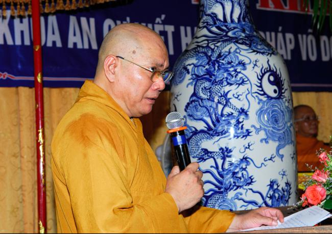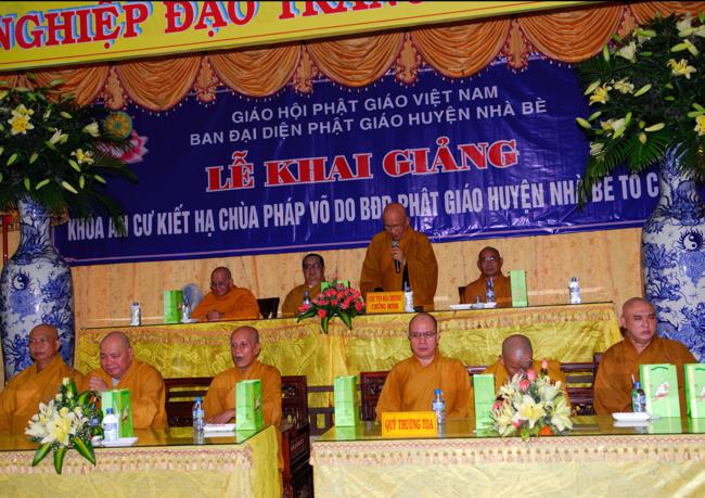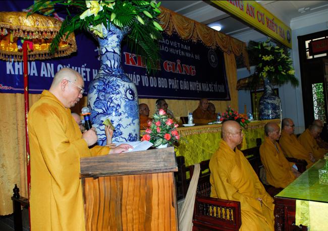 TT Thích Thiện Nghĩa – trưởng ban tổ chức phát biểu khai mạc khóa an cư, TT đã nêu lên tầm quan trọng đối với ba tháng cấm túc an cư, tinh tấn huân tu tam vô lậu học, trưởng dưỡng đạo tâm, trau dồi trí đức và thực hành các công tác Phật sự trong tương lai để xứng đáng là bậc sứ giả tác Như Lai xứ, hành Như Lai hạnh.