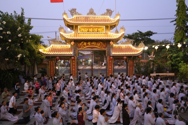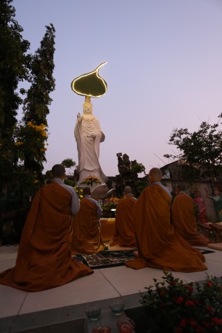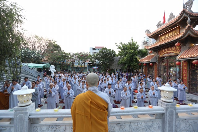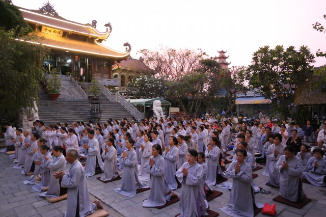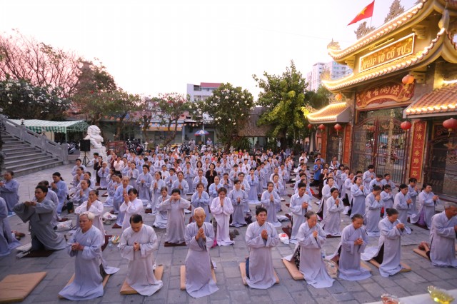Sau nghi thức niêm hương bạch Phật toàn thể đạo tràng trang nghiêm cung đối trước tôn tượng Đức Quán Thế Âm đồng trang nghiêm niệm danh hiệu “Nam mô Quán Thế Âm Bồ-tát” và đảnh lễ 500 lạy cầu nguyện cho mọi người được bình an hạnh phúc.