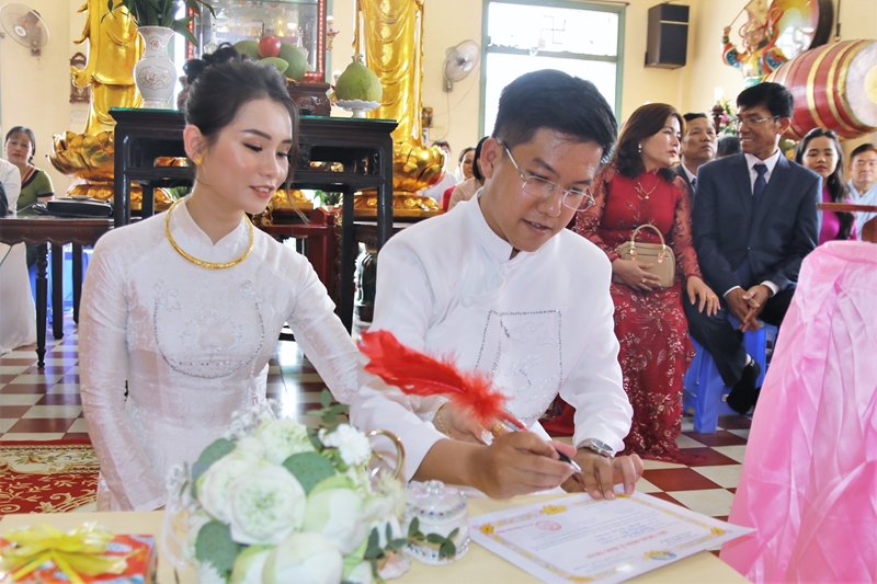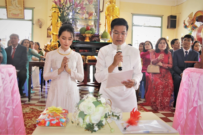 Tại buổi lễ sau nghi thức niêm hương bạch Phật, tụng kinh phước đức là lời huấn từ của Chư Tôn Đức dành cho đôi tân giai nhân, về bổn phận cũng như trách nhiệm của người làm vợ và làm chồng. Đồng thời có trách nhiệm chăm sóc và báo hiếu cho Cha Mẹ đôi bên.