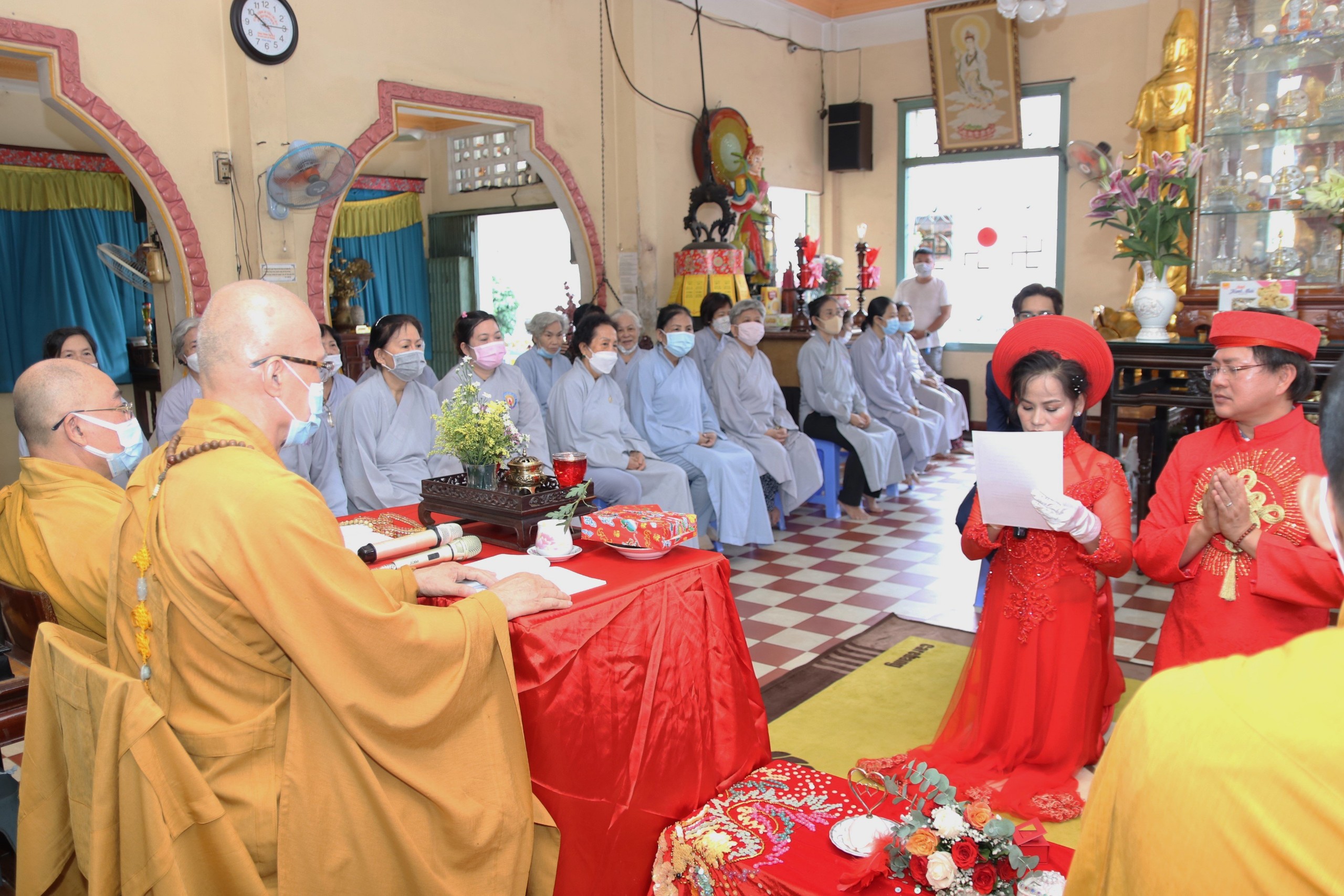 Tại buổi lễ, sau nghi thức niêm hương bạch Phật, tụng kinh phước đức là lời huấn từ của Chư Tôn Đức dành cho đôi tân giai nhân, về bổn phận cũng như trách nhiệm của người làm vợ và làm chồng. Đồng thời có trách nhiệm chăm sóc và báo hiếu cho Cha Mẹ đôi bên.