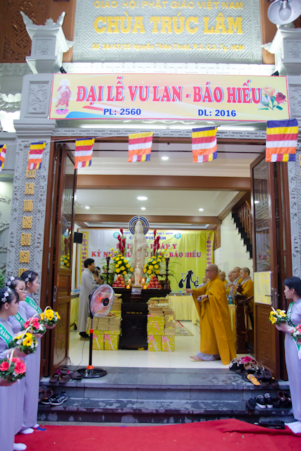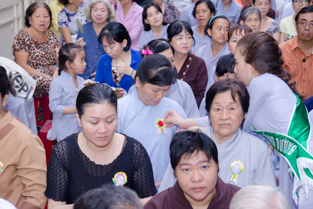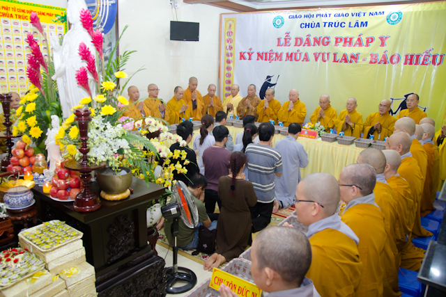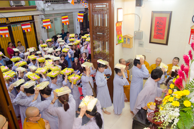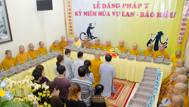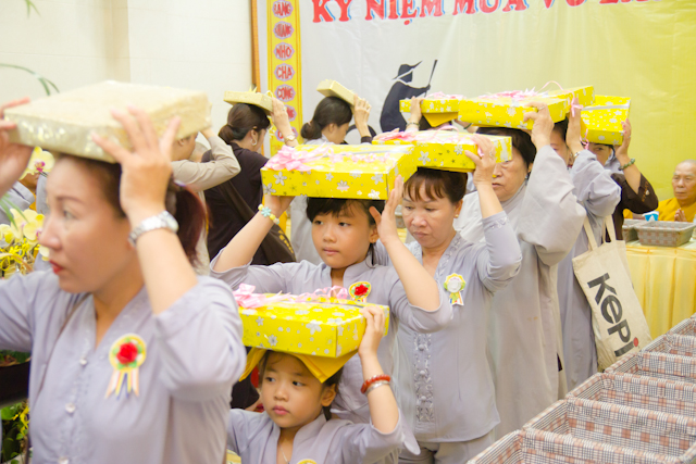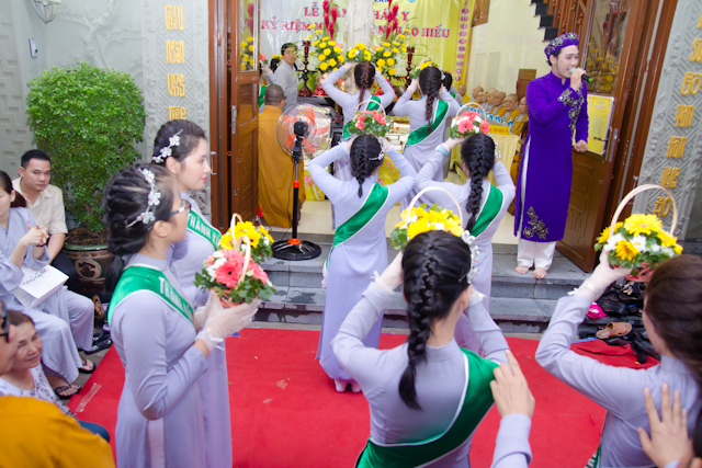 Tiếp theo, đoàn sinh GĐPT dâng hoa cúng dường mừng khánh tuế Chư tôn đức. Sau đó là nghi thức cài Hoa hồng tưởng nhớ Ân sinh thành của Cha Mẹ khi mùa Vu Lan về. Sau cùng là Phật tử dâng pháp y cúng dường Chư tôn đức, mong cầu phước lành hồi hướng cha mẹ hiện tiền được phước thọ tăng long, cửu hiền thất tổ được siêu sinh tịnh độ.