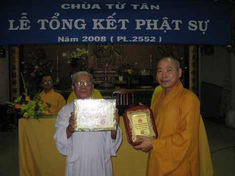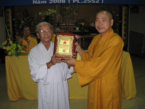 TT. Thích Viên Giác trao bằng tuyên dương công đức cho bác Nguyên Thiện – Trưởng ban Hộ niệm của Chùa