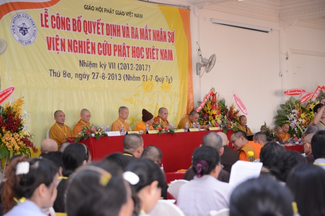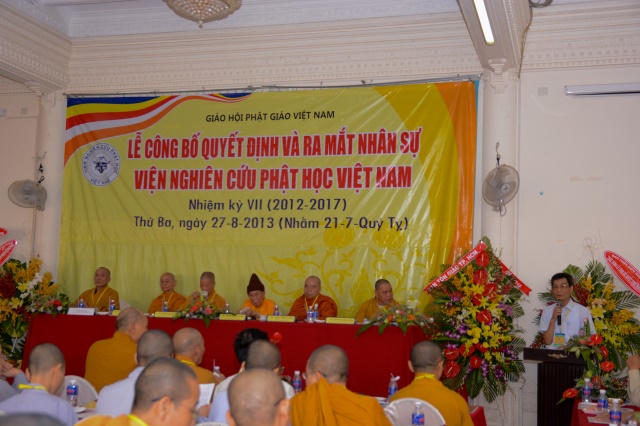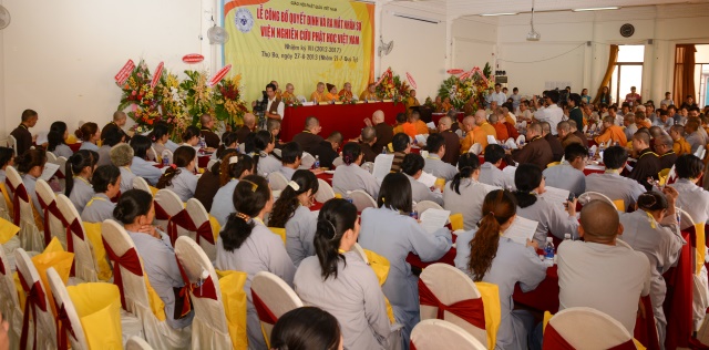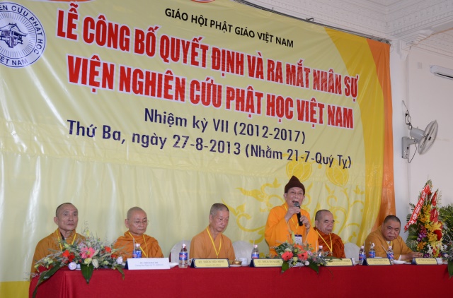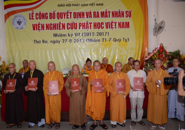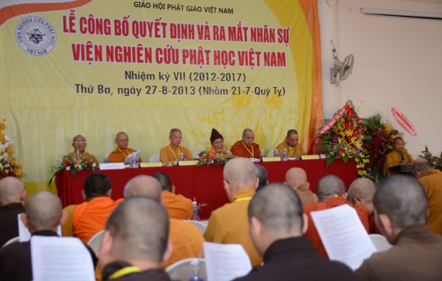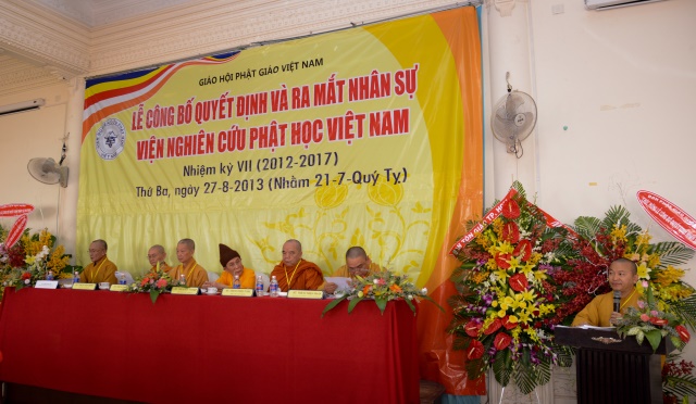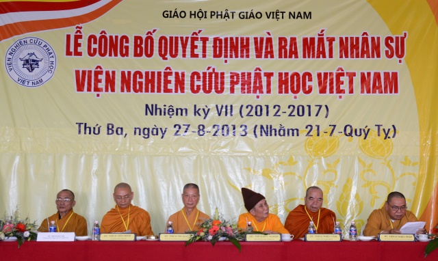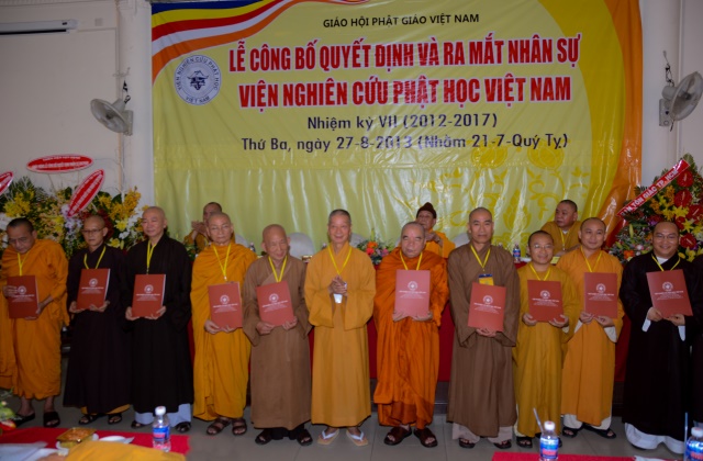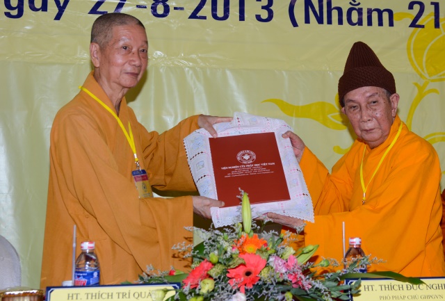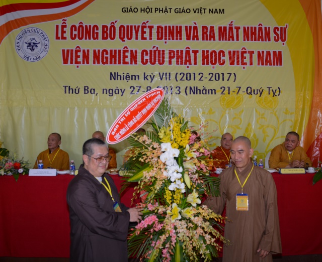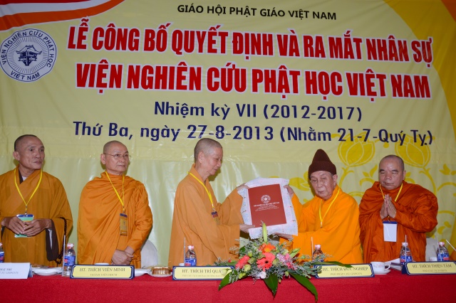HT. Thích Thiện Pháp thay mặt chư tôn đức VP II TW GHPGVN tuyên đọc quyết định của HĐTS GHPGVN. HT. Thích Đức Nghiệp trao quyết định Viện trưởng Viện nghiên cứu HT. Thích Trí Quảng. Cũng tại buổi lễ, HT. Thích Trí Quảng thay mặt chư tôn đức trao quyết định đến các thành phần nhân sự thuộc Viện nghiên cứu nhiệm kỳ VII, 2013 – 2017.