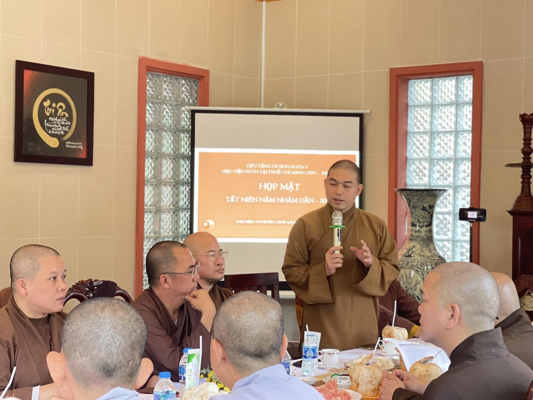 Tại buổi họp mặt, Sư cô Thích Nữ Thánh Tâm báo cáo tổng kết các hoạt động của Ban liên lạc cựu Tăng Ni sinh khóa 5 tại TP.Hồ Chí Minh.