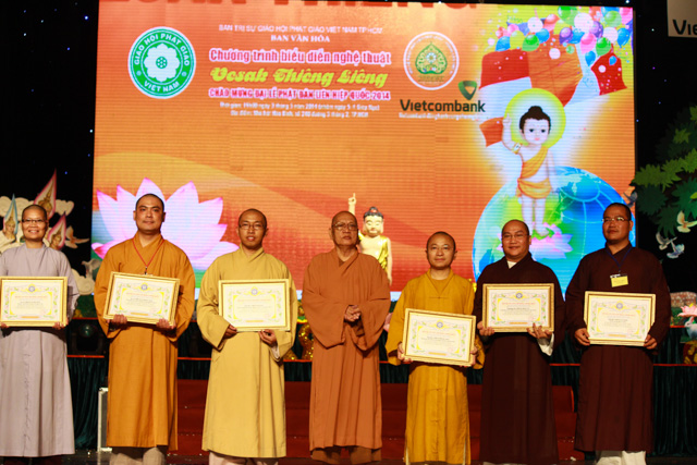Kết thúc phần 1 là phần tán dương công đức của GHPG Tp. HCM cho Ban văn hóa TP, Ban giám khảo; Nhà tài trợ đã có nhiểu công sức đóng góp cho sự thành công của hội thi văn nghệ chào mừng Vesak 2014. Thay mặt cho GHPGVN TP. HCM, HT. Thích Thiện Tánh đã lên trao tặng bằng khen và có đôi lời Đạo từ đến với Ban văn hóa và toàn thể các diễn viên cùng khán giả.
