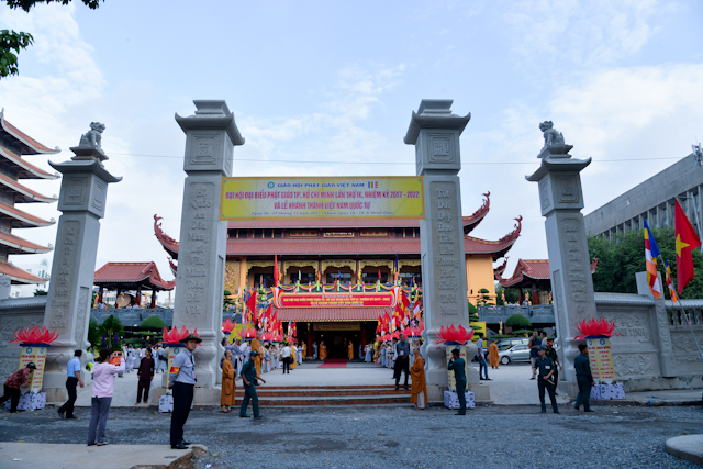 Trước cổng Tam Quan Việt Nam Quốc Tự nơi đón tiếp Đại biểu về tham dự Đại hội