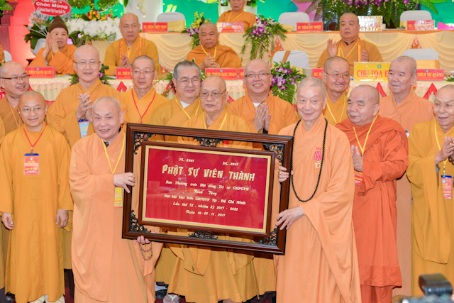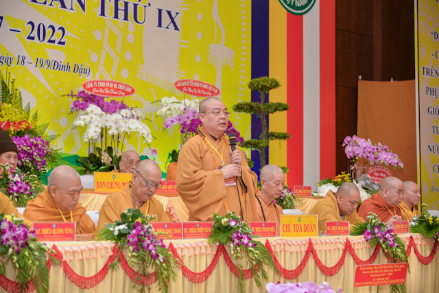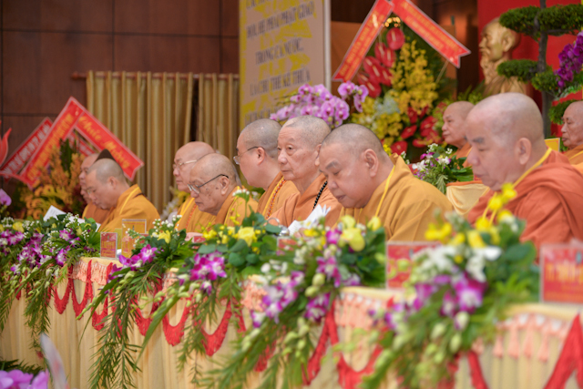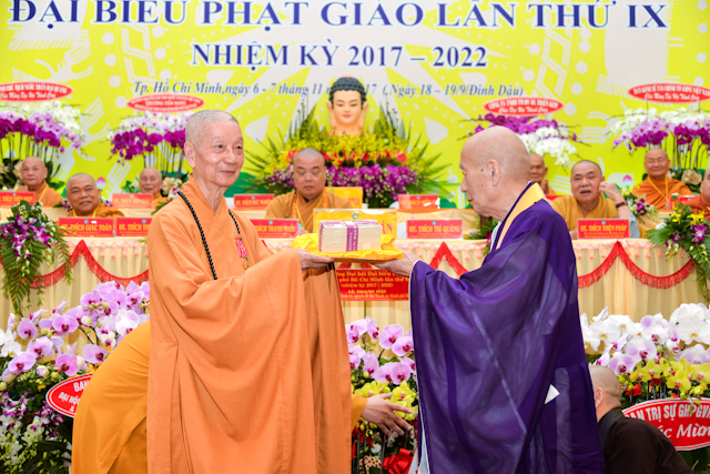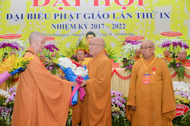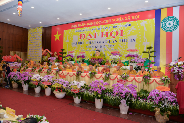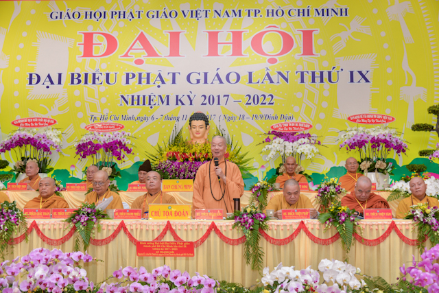 Ban tổ chức Đại Hội đã cung thỉnh chư tôn đức Hòa thượng Thích Trí Quảng – Phó Pháp Chủ Ban Thường Trực HĐCM GHPGVN, Trưởng Ban Trị Sự GHPGVN TP. Hồ Chí Minh; HT. Thích Thiện Pháp – Phó Chủ Tịch Thường Trực HĐTS kiêm Trưởng Ban Tăng Sự TW.GHPGVN; HT. Thích Thanh Nhiễu Phó Chủ Tịch Thường Trực HĐTS kiêm Phó Trưởng Ban Tt Ban Tăng Sự Tw.GHPGVN; HT. Thích Thiện Tánh Phó Chủ Tịch HĐTS GHPGVN; Phó Trưởng Ban Thường Trực GHPGVN Tp. Hồ Chí Minh; HT. Thích Bảo Nghiêm – Phó Chủ Tịch HĐTS, Trưởng Ban Hoằng Pháp TW.GHPGVN; HT. Thích Giác Toàn – Phó Chủ Tịch HĐTS, Phó Trưởng Ban TT-Ban GDTN TW.GHPGVN; HT. Thích Thiện Tâm Phó Chủ Tịch HĐTS, Phó Trưởng Ban PGQT TW.GHPGVN; HT. Thích Gia – Phó Chủ Tịch HĐTS, Trưởng Ban TT-TT TW.GHPGVN; HT. Thích Thanh Quyết – Phó Chủ Tịch HĐTS, Q.Trưởng Ban GDTN TW.GHPGVN; HT. Thích Quảng Hà -Phó chủ tịch HĐTS, Phó ban TT Ban Kiểm soát TW.GHPGVN; HT. Thích Minh Thông – UV. HĐTS, Phó BTS kiêm Trưởng ban Tăng sự GHPGVN TP.HCM; TT. Thích Đức Thiện – Tổng Thư Ký Hội Đồng Trị Sự GHPGVN; TT. Thích Thiện Thống Phó tổng Thư ký HĐTS kiêm Chánh Văn phòng 2 TW.GHPGVN … Quang … làm chủ tọa đoàn Đại Hội Đại Biểu Phật Giáo Việt Nam TP.HCM lần IX.