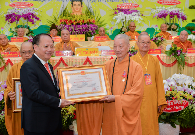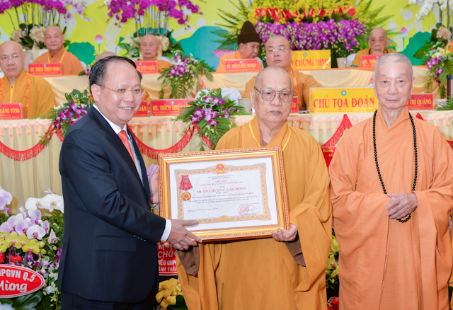ông Tất Thành Cang trao Huy Chương Lao Động hạng nhất đến HT.Thích Trí Quảng vì những đóng góp cho công cuộc xây dựng và phát triển Phật giáo