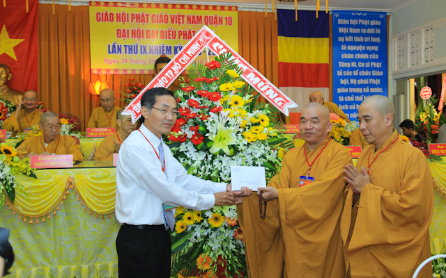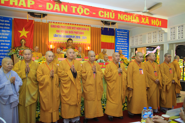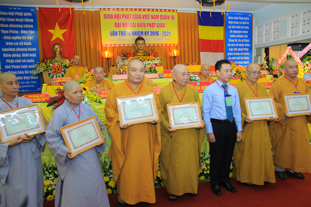 “Trong nhiệm kỳ VIII (2012 – 2016) vừa qua, Giáo hội Phật giáo Quận 10 thực hiện tốt các chủ trương chính sách đường lối của Đảng & Nhà nước, đồng hành cùng với dân tộc theo phương châm: “Đạo pháp – Dân tộc – Chủ nghĩa Xã hội.” Đặc biệt, được sự quan tâm hỗ trợ của Đảng và Chính quyền các cấp; sự lãnh đạo của Ban Thường trực Ban Trị sự GHPGVN Thành phố, sự đồng tâm hiệp lực của chư Tôn đức Tăng Ni Trụ trì các Tự viện, cùng với sự đóng góp tích cực của quý Phật tử, Phật giáo Quận 10 đã gặt hái được nhiều thành quả tốt đẹp về các mặt: Tăng sự, Giáo dục, Hoằng pháp, Hướng dẫn Phật tử, Nghi lễ, Văn hóa, Từ thiện – Xã hội … Những thành tựu nổi bật của Phật giáo Quận 10 trong nhiệm kỳ qua chính là kết quả của một sức mạnh tổng hợp, khối đại đoàn kết nhất quán của toàn thể Tăng Ni, Phật tử Phật giáo Quận 10. Đây chính là nét đặc thù dựa trên tinh thần “Thống nhất ý chí và hành động, thống nhất lãnh đạo và tổ chức, hợp nhất và hài hòa” để cùng nhau phát triển Phật giáo Quận 10 ngày càng vững mạnh.