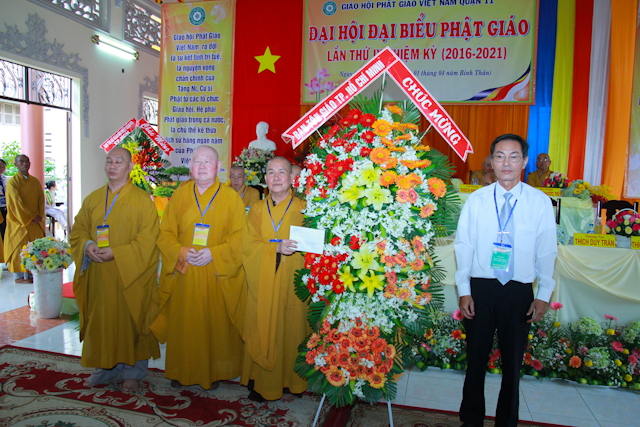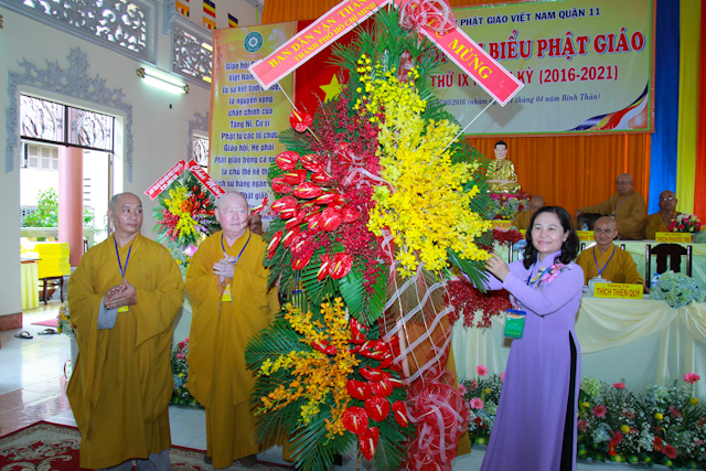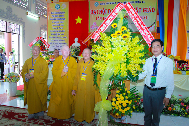 Phát biểu chúc mừng thành công của Đại hội, thay mặt chính quyền; ông Trương Quốc Cương, Phó Chủ tịch UBND Q.11 gửi lời phát biểu chúc mừng đến Đại hội, chư tôn đức tân BTS PG Q.11. Ông đã đánh giá cao những đóng góp của Phật giáo quận. Đồng thời, ông cũng nhấn mạnh việc chính quyền luôn tạo điều kiện cho Phật giáo quận phát triển hơn. Bên cạnh đó cũng gửi lời chúc sức khỏe và an lạc đến chư tôn đức Tăng Ni và quý vị Phật tử nhân mùa Phật đản.