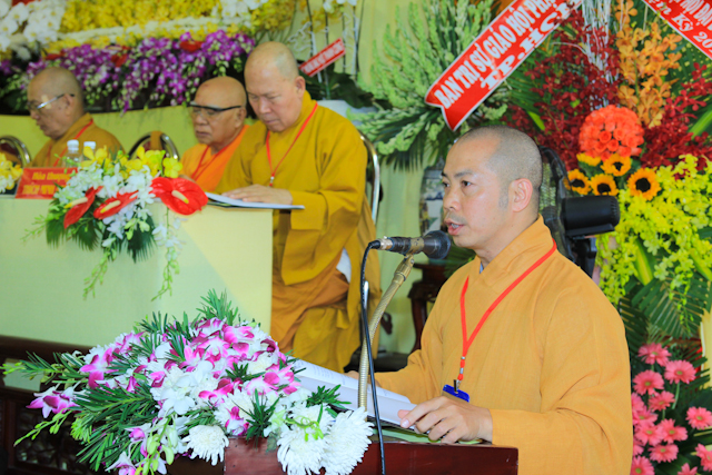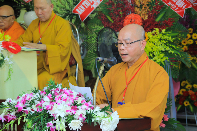 Tiếp đến, ĐĐ. Thích Thị Trụ – Chánh Thư ký trình bày báo cáo những hoạt động Phật sự trong nhiệm kỳ VIII và điều ra phương hướng hoạt động nhiệm kỳ XI.