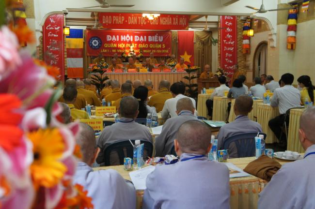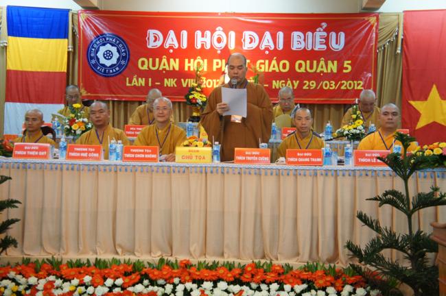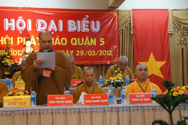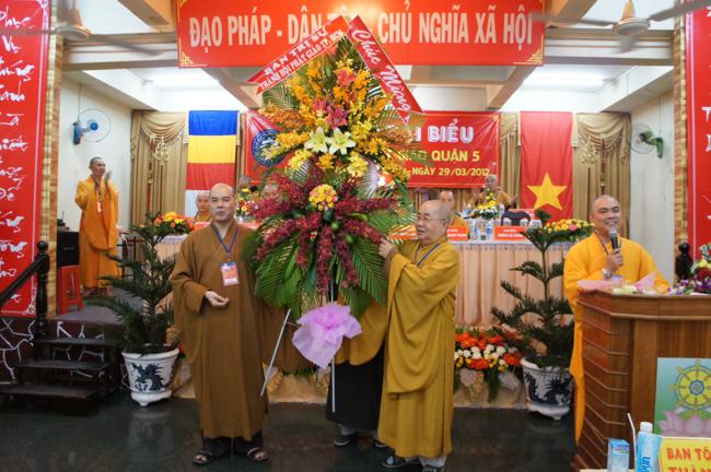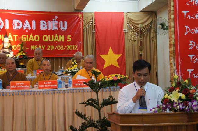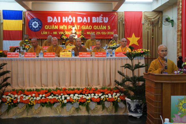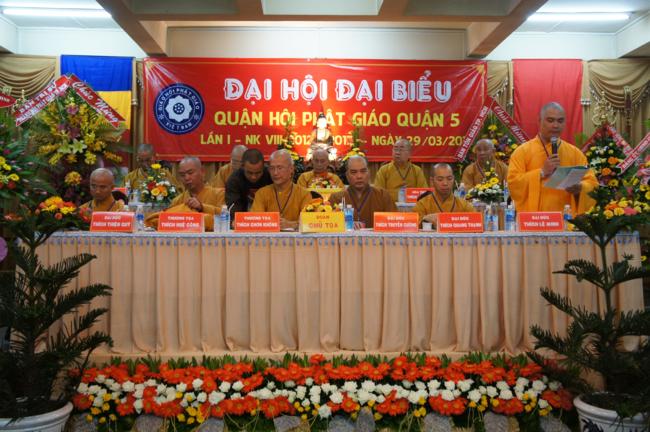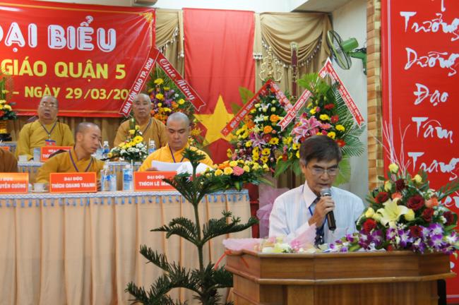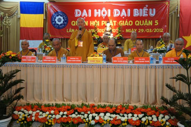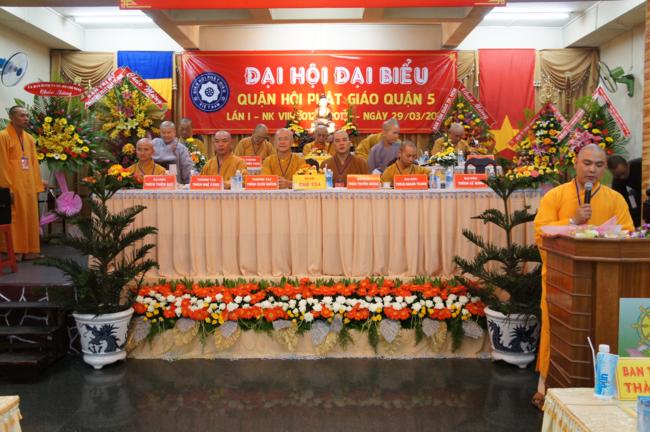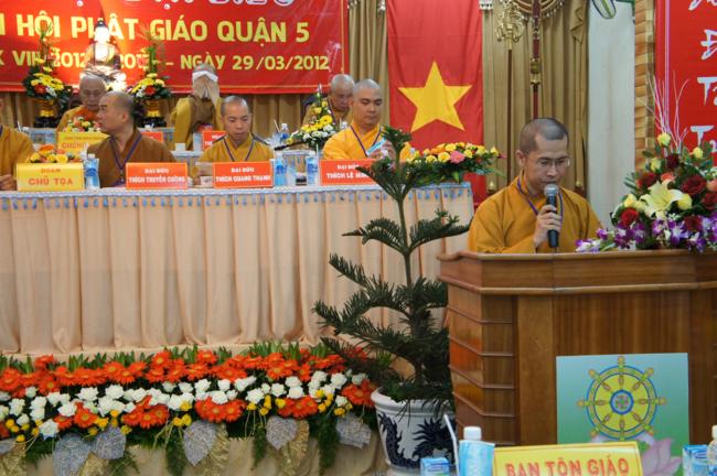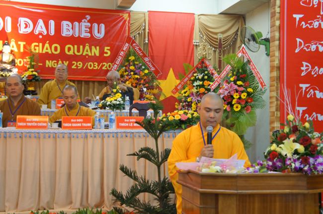 Phát biểu khai mạc TT. Thích Truyền Cường – Chánh đại diện Phật giáo Q. 5 nhấn mạnh; Trong 05 năm qua, với những điều kiện thuận lợi về chủ quan và khách quan, được sự chỉ đạo của Thành hội Phật giáo TP.HCM, sự quan tâm hỗ trợ và giúp đở chân tình của chính quyền Mặt trận và các ban ngành đoàn thể các cấp Q. 5, Ban đại diện đã sát cánh cùng Tăng ni Phật tử tích cực thực hiện các mặt công tác Phật sự, tham gia từ thiện xã hội và đã gặt hái được nhiểu thành tựu khả quan. Với những thành tựu Phật sự sau nhiều năm đổi mới của THPG đã tạo ra nhiều cơ duyên thuận lợi, một hướng phát triển Phật giáo Q. 5, một lần nữa đã khẳng định vai trò vị trí của mình trong ngôi nhà chung của Giáo hội. Từ đó đã minh định nhiệm vụ, công việc phải làm để vươn lên, thích hợp với xu hướng chung của đất nước và thời đại.