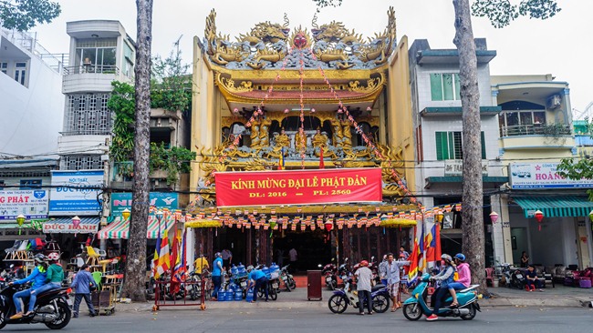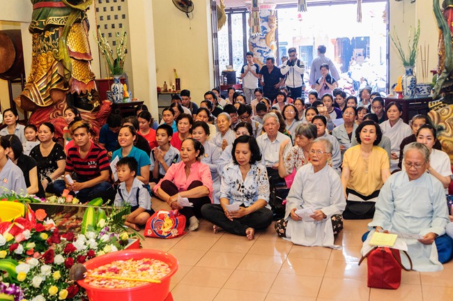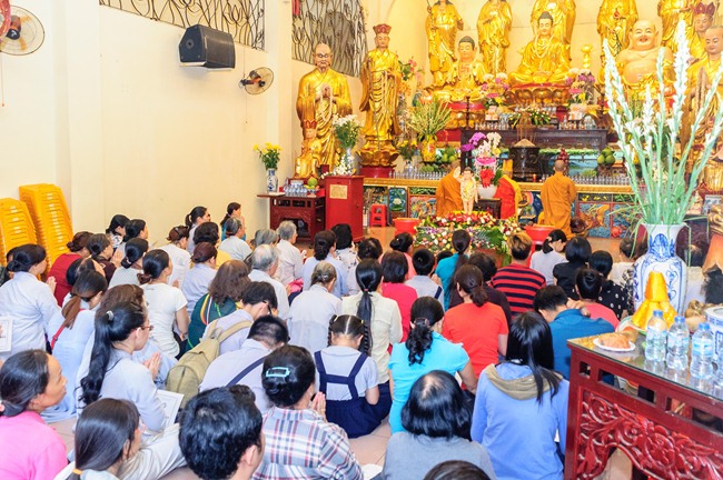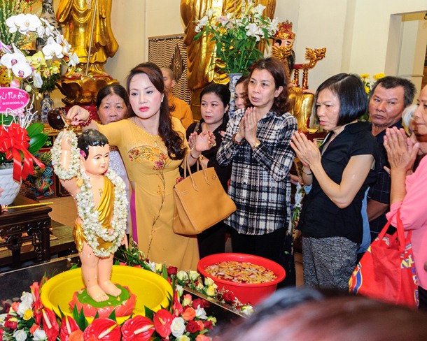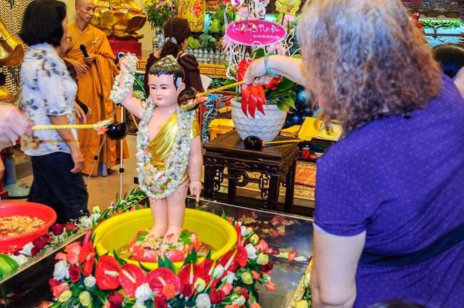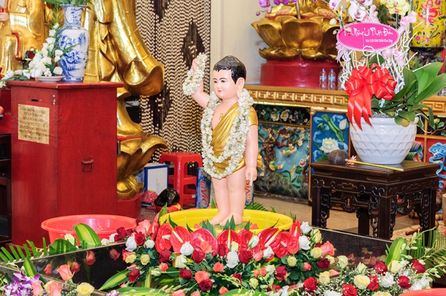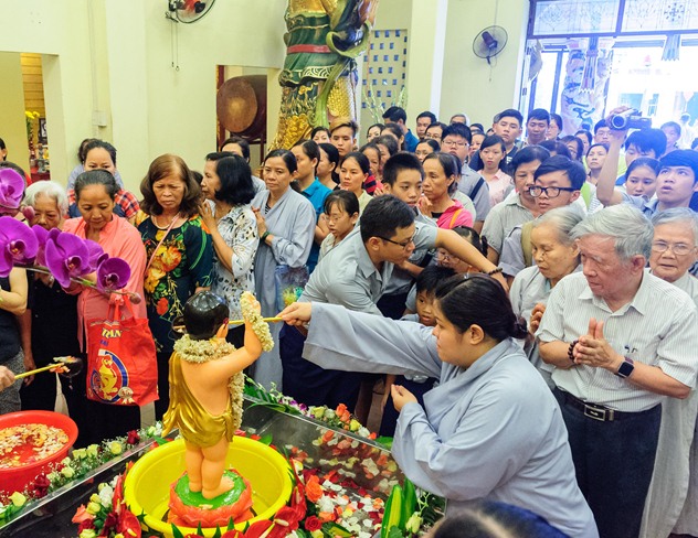 Sau nghi thức niêm hương bạch Phật, tụng kinh mừng Khánh Đản Đức Phật Thích Ca Mâu Ni, cầu nguyện cho thế giới hòa bình bình, chúng sinh an lạc, Đại Đức Thích Giác Định đã hướng dẫn các Phật tử thực hiện nghi thức tắm Phật truyền thống.