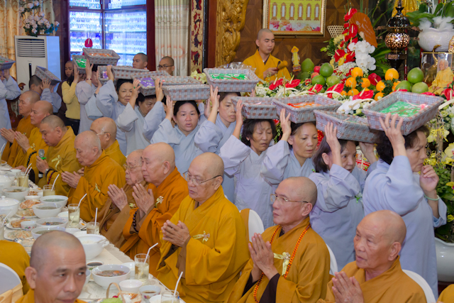 Tiếp theo, Đạo tràng Phật từ đội pháp y nhiễu Phật cúng dường lên Chư tôn đức. Thay mặt chư Hòa thượng chứng minh, HT.Thích Như Tín đã ban lời đạo từ tại buổi lễ, Hòa thượng thành tâm thọ nhận vật phẩm cúng dường, cùng chư Tăng nhất tâm cầu nguyện cho pháp hội đạo tràng luôn sống an lành trong chánh pháp, cha mẹ hiện tiền được phước thọ tặng, cửu hiền thất tổ được siêu sinh tịnh độ.