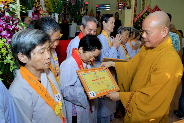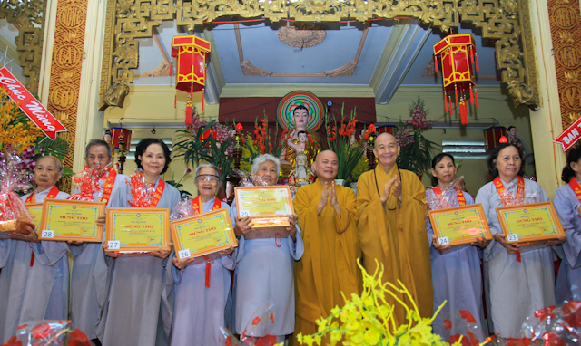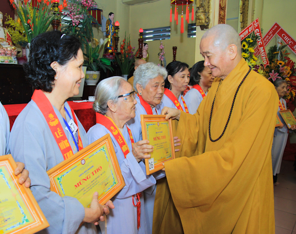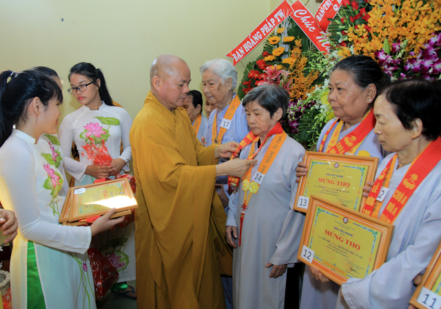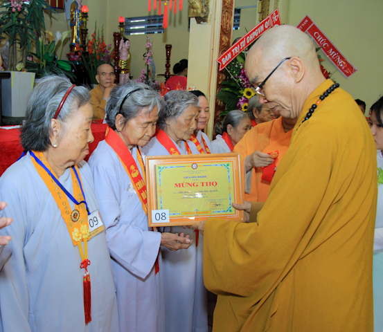 Cũng tại buổi lễ, chư tôn Hòa thượng Chứng minh đã tặng quà và trao bằng chúc thọ đến các Phật tử lớn tuổi với nhiều năm tinh tấn tu tập và phụng sự Tam bảo tại chùa Hòa khánh.